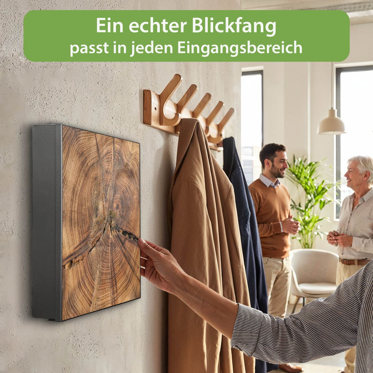 Bringe Ordnung und Eleganz in deinen Eingangsbereich mit dem banjado Schlüsselkasten Motiv Motiv Jahresringe. Die moderne Schlüsselbox kombiniert funktionales Design mit hochwertiger Verarbeitung und wird so zu einem echten Hingucker in Flur, Büro oder Ferienwohnung. ✅ Stilvolle Schlüsselaufbewahrung mit Motiv Motiv Jahresringe Der Design-Schlüsselkasten Motiv Motiv Jahresringe bietet Platz für bis zu 32 Schlüssel, die auf 4 stabilen Reihen mit je 8 Haken übersichtlich verstaut werden. Mit seinen kompakten Maßen von 30 x 30 x 5 cm passt die Schlüsselbox perfekt auch in kleinere Räume. Der schwarz lackierte Stahlkorpus mit rechts angeschlagenem Türscharnier harmoniert mit gedruckten Folie auf der Front und fügt sich nahtlos in jedes Wohnambiente ein. Ob als Schlüsselorganizer für Zuhause oder als praktische Lösung für Büros, Praxen und Gewerbe, der banjado Schlüsselkasten sorgt für Ordnung und Übersicht. Dank der magnetischen, mit Kreidestiften beschreibbaren Folie auf der Front kannst du Notizen anheften oder Termine direkt auf der Oberfläche festhalten. Die Schlüsselbox Motiv Motiv Jahresringe zur Wandmontage wird inklusive Befestigungsmaterial geliefert und ist schnell angebracht. So hast du deine Schlüssel jederzeit griffbereit und zugleich stilvoll verstaut. Mit diesem banjado Schlüsselkasten Motiv Motiv Jahresringe kombinierst du praktische Aufbewahrung mit stilvollem Wohndesign. Ob privat oder geschäftlich, die Schlüsselbox sorgt für mehr Ordnung, Übersicht und ein wohnliches Ambiente.Vorteile im Überblick