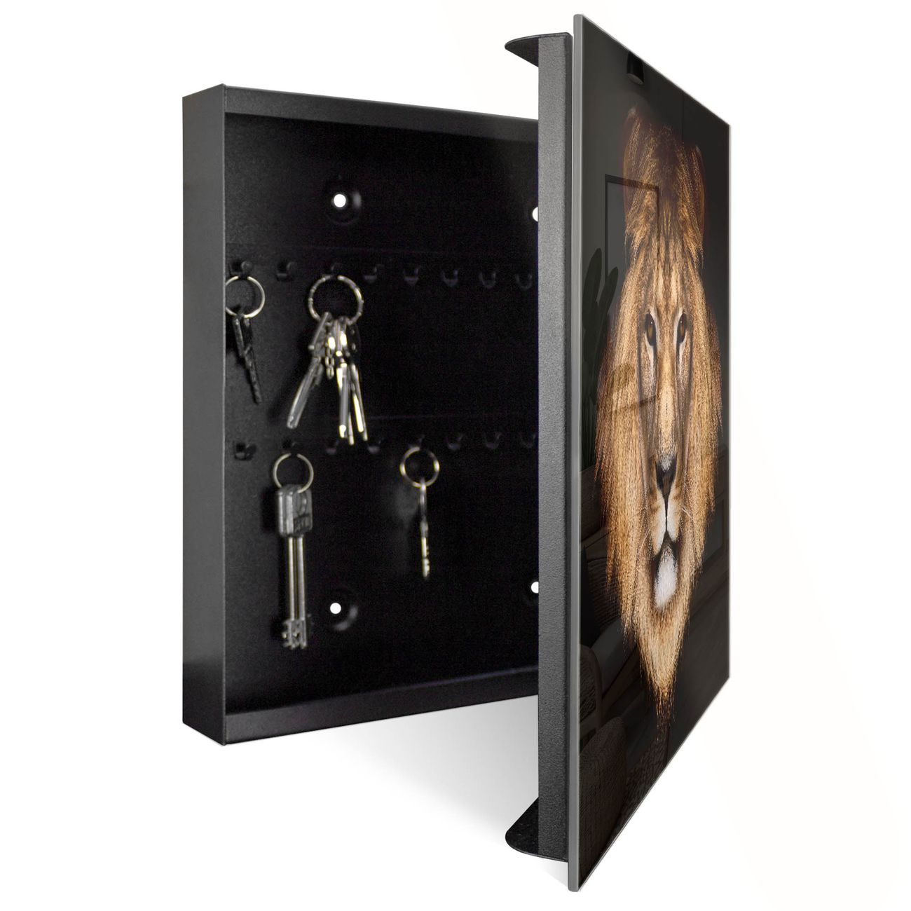 Bringe Ordnung und Eleganz in deinen Eingangsbereich mit dem banjado Schlüsselkasten Motiv Motiv Jakob. Die moderne Schlüsselbox kombiniert funktionales Design mit hochwertiger Verarbeitung und wird so zu einem echten Hingucker in Flur, Büro oder Ferienwohnung. ✅ Stilvolle Schlüsselaufbewahrung mit Glasfront im Motiv Motiv Jakob Der Design-Schlüsselkasten Motiv Motiv Jakob bietet Platz für bis zu 50 Schlüssel, die auf 5 stabilen Reihen mit je 10 Haken übersichtlich verstaut werden. Mit seinen kompakten Maßen von 30 x 30 x 5 cm passt die Schlüsselbox perfekt auch in kleinere Räume. Der schwarz lackierte Stahlkorpus mit rechts angeschlagenem Türscharnier harmoniert mit der Glasfront und fügt sich nahtlos in jedes Wohnambiente ein. Ob als Schlüsselorganizer für Zuhause oder als praktische Lösung für Büros, Praxen und Gewerbe, der banjado Schlüsselkasten sorgt für Ordnung und Übersicht. Dank der magnetischen, mit Kreidestiften beschreibbaren Glasfront kannst du Notizen anheften oder Termine direkt auf der Oberfläche festhalten. Die Schlüsselbox Motiv Motiv Jakob zur Wandmontage wird inklusive Befestigungsmaterial geliefert und ist schnell angebracht. So hast du deine Schlüssel jederzeit griffbereit und zugleich stilvoll verstaut. Mit diesem banjado Schlüsselkasten Motiv Motiv Jakob kombinierst du praktische Aufbewahrung mit stilvollem Wohndesign. Ob privat oder geschäftlich, die Schlüsselbox sorgt für mehr Ordnung, Übersicht und ein wohnliches Ambiente.Vorteile im Überblick