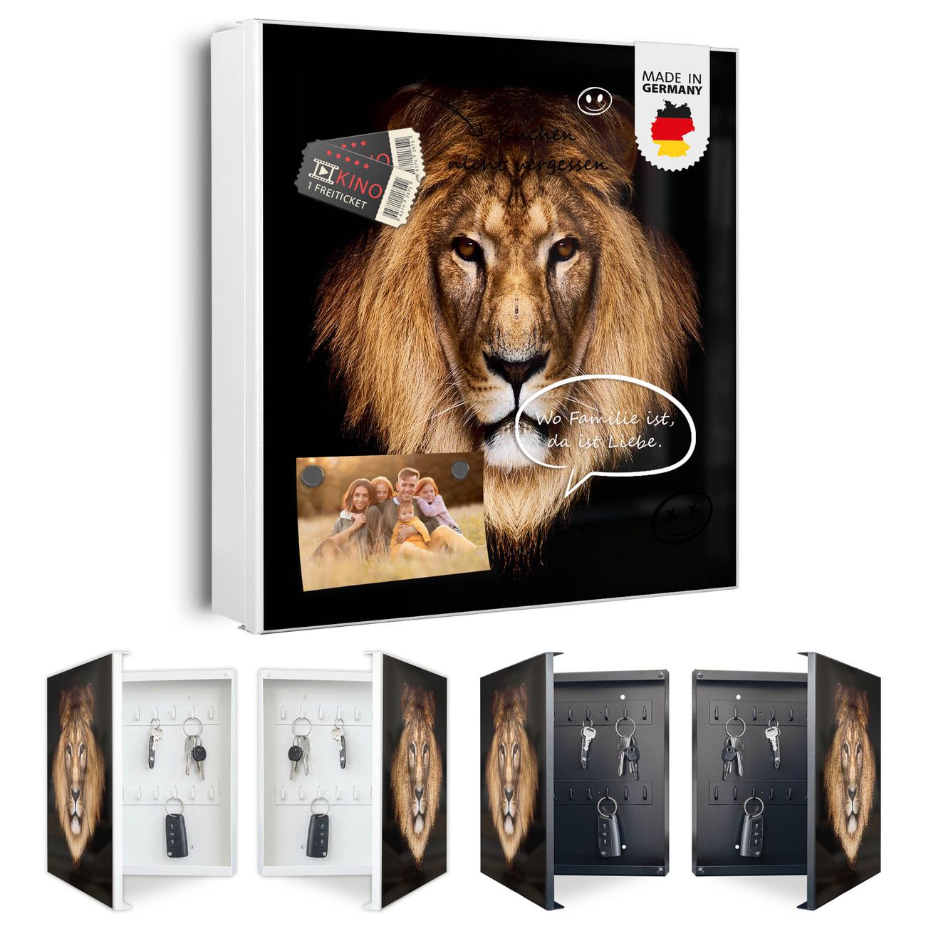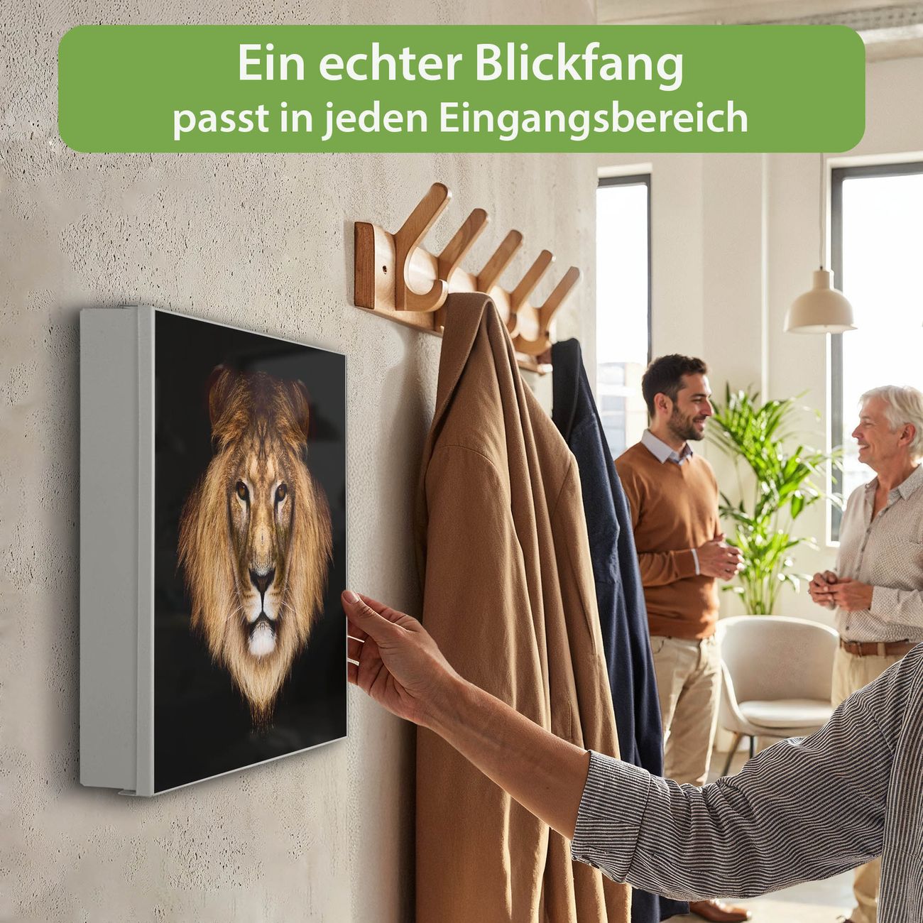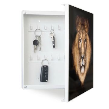 Bringe Ordnung und Eleganz in deinen Eingangsbereich mit dem banjado Schlüsselkasten Motiv Motiv Jakob. Die moderne Schlüsselbox kombiniert funktionales Design mit hochwertiger Verarbeitung und wird so zu einem echten Hingucker in Flur, Büro oder Ferienwohnung. ✅ Stilvolle Schlüsselaufbewahrung mit Motiv Motiv Jakob Der Design-Schlüsselkasten Motiv Motiv Jakob bietet Platz für bis zu 32 Schlüssel, die auf 4 stabilen Reihen mit je 8 Haken übersichtlich verstaut werden. Mit seinen kompakten Maßen von 30 x 30 x 5 cm passt die Schlüsselbox perfekt auch in kleinere Räume. Der weiß lackierte Stahlkorpus mit rechts angeschlagenem Türscharnier harmoniert mit gedruckten Folie auf der Front und fügt sich nahtlos in jedes Wohnambiente ein. Ob als Schlüsselorganizer für Zuhause oder als praktische Lösung für Büros, Praxen und Gewerbe, der banjado Schlüsselkasten sorgt für Ordnung und Übersicht. Dank der magnetischen, mit Kreidestiften beschreibbaren Folie auf der Front kannst du Notizen anheften oder Termine direkt auf der Oberfläche festhalten. Die Schlüsselbox Motiv Motiv Jakob zur Wandmontage wird inklusive Befestigungsmaterial geliefert und ist schnell angebracht. So hast du deine Schlüssel jederzeit griffbereit und zugleich stilvoll verstaut. Mit diesem banjado Schlüsselkasten Motiv Motiv Jakob kombinierst du praktische Aufbewahrung mit stilvollem Wohndesign. Ob privat oder geschäftlich, die Schlüsselbox sorgt für mehr Ordnung, Übersicht und ein wohnliches Ambiente.Vorteile im Überblick