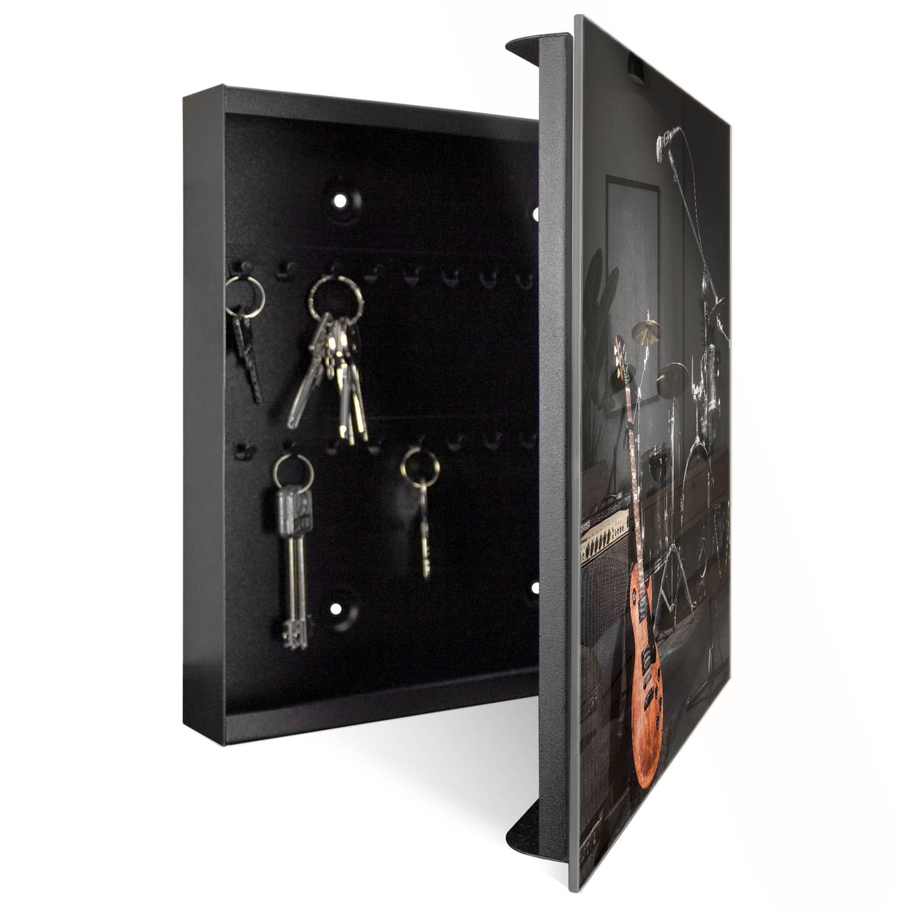 Bringe Ordnung und Eleganz in deinen Eingangsbereich mit dem banjado Schlüsselkasten Motiv Motiv Jam Session. Die moderne Schlüsselbox kombiniert funktionales Design mit hochwertiger Verarbeitung und wird so zu einem echten Hingucker in Flur, Büro oder Ferienwohnung. ✅ Stilvolle Schlüsselaufbewahrung mit Glasfront im Motiv Motiv Jam Session Der Design-Schlüsselkasten Motiv Motiv Jam Session bietet Platz für bis zu 50 Schlüssel, die auf 5 stabilen Reihen mit je 10 Haken übersichtlich verstaut werden. Mit seinen kompakten Maßen von 30 x 30 x 5 cm passt die Schlüsselbox perfekt auch in kleinere Räume. Der schwarz lackierte Stahlkorpus mit rechts angeschlagenem Türscharnier harmoniert mit der Glasfront und fügt sich nahtlos in jedes Wohnambiente ein. Ob als Schlüsselorganizer für Zuhause oder als praktische Lösung für Büros, Praxen und Gewerbe, der banjado Schlüsselkasten sorgt für Ordnung und Übersicht. Dank der magnetischen, mit Kreidestiften beschreibbaren Glasfront kannst du Notizen anheften oder Termine direkt auf der Oberfläche festhalten. Die Schlüsselbox Motiv Motiv Jam Session zur Wandmontage wird inklusive Befestigungsmaterial geliefert und ist schnell angebracht. So hast du deine Schlüssel jederzeit griffbereit und zugleich stilvoll verstaut. Mit diesem banjado Schlüsselkasten Motiv Motiv Jam Session kombinierst du praktische Aufbewahrung mit stilvollem Wohndesign. Ob privat oder geschäftlich, die Schlüsselbox sorgt für mehr Ordnung, Übersicht und ein wohnliches Ambiente.Vorteile im Überblick