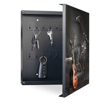 Bringe Ordnung und Eleganz in deinen Eingangsbereich mit dem banjado Schlüsselkasten Motiv Motiv Jam Session. Die moderne Schlüsselbox kombiniert funktionales Design mit hochwertiger Verarbeitung und wird so zu einem echten Hingucker in Flur, Büro oder Ferienwohnung. ✅ Stilvolle Schlüsselaufbewahrung mit Motiv Motiv Jam Session Der Design-Schlüsselkasten Motiv Motiv Jam Session bietet Platz für bis zu 32 Schlüssel, die auf 4 stabilen Reihen mit je 8 Haken übersichtlich verstaut werden. Mit seinen kompakten Maßen von 30 x 30 x 5 cm passt die Schlüsselbox perfekt auch in kleinere Räume. Der schwarz lackierte Stahlkorpus mit rechts angeschlagenem Türscharnier harmoniert mit gedruckten Folie auf der Front und fügt sich nahtlos in jedes Wohnambiente ein. Ob als Schlüsselorganizer für Zuhause oder als praktische Lösung für Büros, Praxen und Gewerbe, der banjado Schlüsselkasten sorgt für Ordnung und Übersicht. Dank der magnetischen, mit Kreidestiften beschreibbaren Folie auf der Front kannst du Notizen anheften oder Termine direkt auf der Oberfläche festhalten. Die Schlüsselbox Motiv Motiv Jam Session zur Wandmontage wird inklusive Befestigungsmaterial geliefert und ist schnell angebracht. So hast du deine Schlüssel jederzeit griffbereit und zugleich stilvoll verstaut. Mit diesem banjado Schlüsselkasten Motiv Motiv Jam Session kombinierst du praktische Aufbewahrung mit stilvollem Wohndesign. Ob privat oder geschäftlich, die Schlüsselbox sorgt für mehr Ordnung, Übersicht und ein wohnliches Ambiente.Vorteile im Überblick
