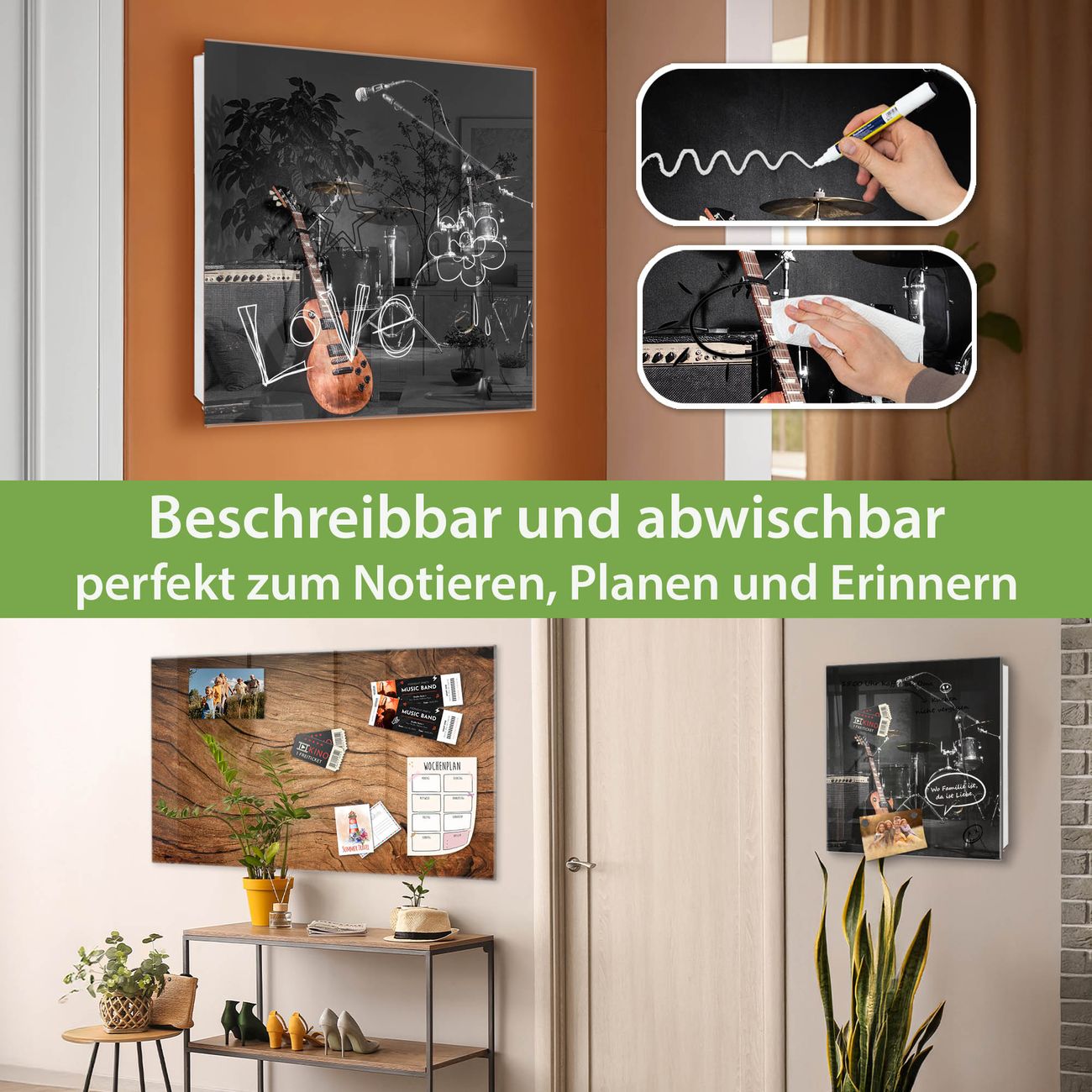 Bringe Ordnung und Eleganz in deinen Eingangsbereich mit dem banjado Schlüsselkasten Motiv Motiv Jam Session. Die moderne Schlüsselbox kombiniert funktionales Design mit hochwertiger Verarbeitung und wird so zu einem echten Hingucker in Flur, Büro oder Ferienwohnung. ✅ Stilvolle Schlüsselaufbewahrung mit Glasfront im Motiv Motiv Jam Session Der Design-Schlüsselkasten Motiv Motiv Jam Session bietet Platz für bis zu 50 Schlüssel, die auf 5 stabilen Reihen mit je 10 Haken übersichtlich verstaut werden. Mit seinen kompakten Maßen von 30 x 30 x 5 cm passt die Schlüsselbox perfekt auch in kleinere Räume. Der weiß lackierte Stahlkorpus mit rechts angeschlagenem Türscharnier harmoniert mit der Glasfront und fügt sich nahtlos in jedes Wohnambiente ein. Ob als Schlüsselorganizer für Zuhause oder als praktische Lösung für Büros, Praxen und Gewerbe, der banjado Schlüsselkasten sorgt für Ordnung und Übersicht. Dank der magnetischen, mit Kreidestiften beschreibbaren Glasfront kannst du Notizen anheften oder Termine direkt auf der Oberfläche festhalten. Die Schlüsselbox Motiv Motiv Jam Session zur Wandmontage wird inklusive Befestigungsmaterial geliefert und ist schnell angebracht. So hast du deine Schlüssel jederzeit griffbereit und zugleich stilvoll verstaut. Mit diesem banjado Schlüsselkasten Motiv Motiv Jam Session kombinierst du praktische Aufbewahrung mit stilvollem Wohndesign. Ob privat oder geschäftlich, die Schlüsselbox sorgt für mehr Ordnung, Übersicht und ein wohnliches Ambiente.Vorteile im Überblick