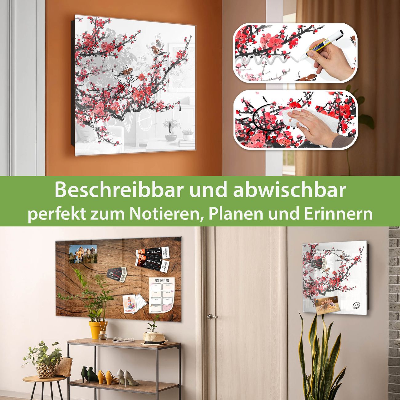 Bringe Ordnung und Eleganz in deinen Eingangsbereich mit dem banjado Schlüsselkasten Motiv Motiv Japanische Blüten 1. Die moderne Schlüsselbox kombiniert funktionales Design mit hochwertiger Verarbeitung und wird so zu einem echten Hingucker in Flur, Büro oder Ferienwohnung. ✅ Stilvolle Schlüsselaufbewahrung mit Glasfront im Motiv Motiv Japanische Blüten 1 Der Design-Schlüsselkasten Motiv Motiv Japanische Blüten 1 bietet Platz für bis zu 50 Schlüssel, die auf 5 stabilen Reihen mit je 10 Haken übersichtlich verstaut werden. Mit seinen kompakten Maßen von 30 x 30 x 5 cm passt die Schlüsselbox perfekt auch in kleinere Räume. Der schwarz lackierte Stahlkorpus mit rechts angeschlagenem Türscharnier harmoniert mit der Glasfront und fügt sich nahtlos in jedes Wohnambiente ein. Ob als Schlüsselorganizer für Zuhause oder als praktische Lösung für Büros, Praxen und Gewerbe, der banjado Schlüsselkasten sorgt für Ordnung und Übersicht. Dank der magnetischen, mit Kreidestiften beschreibbaren Glasfront kannst du Notizen anheften oder Termine direkt auf der Oberfläche festhalten. Die Schlüsselbox Motiv Motiv Japanische Blüten 1 zur Wandmontage wird inklusive Befestigungsmaterial geliefert und ist schnell angebracht. So hast du deine Schlüssel jederzeit griffbereit und zugleich stilvoll verstaut. Mit diesem banjado Schlüsselkasten Motiv Motiv Japanische Blüten 1 kombinierst du praktische Aufbewahrung mit stilvollem Wohndesign. Ob privat oder geschäftlich, die Schlüsselbox sorgt für mehr Ordnung, Übersicht und ein wohnliches Ambiente.Vorteile im Überblick