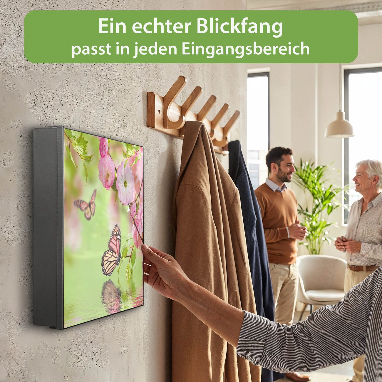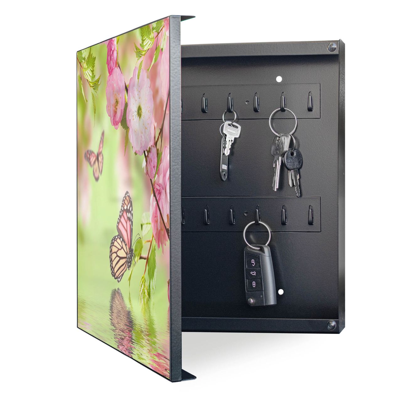 Bringe Ordnung und Eleganz in deinen Eingangsbereich mit dem banjado Schlüsselkasten Motiv Motiv Japanische Kirschblüte. Die moderne Schlüsselbox kombiniert funktionales Design mit hochwertiger Verarbeitung und wird so zu einem echten Hingucker in Flur, Büro oder Ferienwohnung. ✅ Stilvolle Schlüsselaufbewahrung mit Motiv Motiv Japanische Kirschblüte Der Design-Schlüsselkasten Motiv Motiv Japanische Kirschblüte bietet Platz für bis zu 32 Schlüssel, die auf 4 stabilen Reihen mit je 8 Haken übersichtlich verstaut werden. Mit seinen kompakten Maßen von 30 x 30 x 5 cm passt die Schlüsselbox perfekt auch in kleinere Räume. Der schwarz lackierte Stahlkorpus mit links angeschlagenem Türscharnier harmoniert mit gedruckten Folie auf der Front und fügt sich nahtlos in jedes Wohnambiente ein. Ob als Schlüsselorganizer für Zuhause oder als praktische Lösung für Büros, Praxen und Gewerbe, der banjado Schlüsselkasten sorgt für Ordnung und Übersicht. Dank der magnetischen, mit Kreidestiften beschreibbaren Folie auf der Front kannst du Notizen anheften oder Termine direkt auf der Oberfläche festhalten. Die Schlüsselbox Motiv Motiv Japanische Kirschblüte zur Wandmontage wird inklusive Befestigungsmaterial geliefert und ist schnell angebracht. So hast du deine Schlüssel jederzeit griffbereit und zugleich stilvoll verstaut. Mit diesem banjado Schlüsselkasten Motiv Motiv Japanische Kirschblüte kombinierst du praktische Aufbewahrung mit stilvollem Wohndesign. Ob privat oder geschäftlich, die Schlüsselbox sorgt für mehr Ordnung, Übersicht und ein wohnliches Ambiente.Vorteile im Überblick
