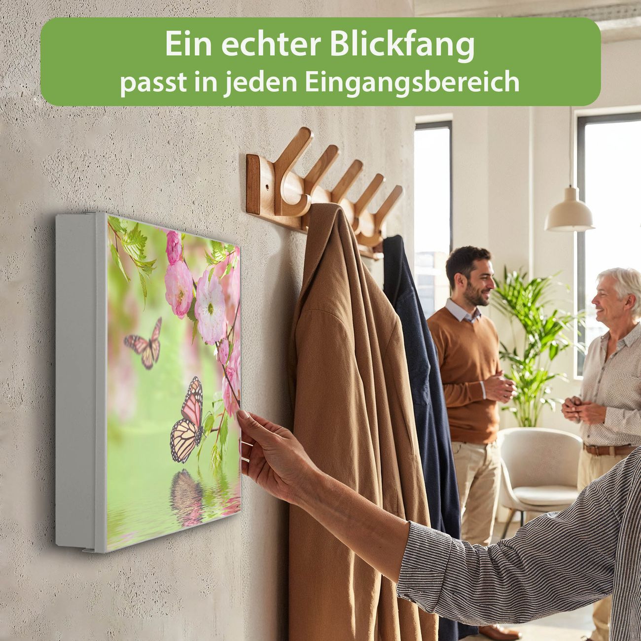 Bringe Ordnung und Eleganz in deinen Eingangsbereich mit dem banjado Schlüsselkasten Motiv Motiv Japanische Kirschblüte. Die moderne Schlüsselbox kombiniert funktionales Design mit hochwertiger Verarbeitung und wird so zu einem echten Hingucker in Flur, Büro oder Ferienwohnung. ✅ Stilvolle Schlüsselaufbewahrung mit Motiv Motiv Japanische Kirschblüte Der Design-Schlüsselkasten Motiv Motiv Japanische Kirschblüte bietet Platz für bis zu 32 Schlüssel, die auf 4 stabilen Reihen mit je 8 Haken übersichtlich verstaut werden. Mit seinen kompakten Maßen von 30 x 30 x 5 cm passt die Schlüsselbox perfekt auch in kleinere Räume. Der weiß lackierte Stahlkorpus mit links angeschlagenem Türscharnier harmoniert mit gedruckten Folie auf der Front und fügt sich nahtlos in jedes Wohnambiente ein. Ob als Schlüsselorganizer für Zuhause oder als praktische Lösung für Büros, Praxen und Gewerbe, der banjado Schlüsselkasten sorgt für Ordnung und Übersicht. Dank der magnetischen, mit Kreidestiften beschreibbaren Folie auf der Front kannst du Notizen anheften oder Termine direkt auf der Oberfläche festhalten. Die Schlüsselbox Motiv Motiv Japanische Kirschblüte zur Wandmontage wird inklusive Befestigungsmaterial geliefert und ist schnell angebracht. So hast du deine Schlüssel jederzeit griffbereit und zugleich stilvoll verstaut. Mit diesem banjado Schlüsselkasten Motiv Motiv Japanische Kirschblüte kombinierst du praktische Aufbewahrung mit stilvollem Wohndesign. Ob privat oder geschäftlich, die Schlüsselbox sorgt für mehr Ordnung, Übersicht und ein wohnliches Ambiente.Vorteile im Überblick