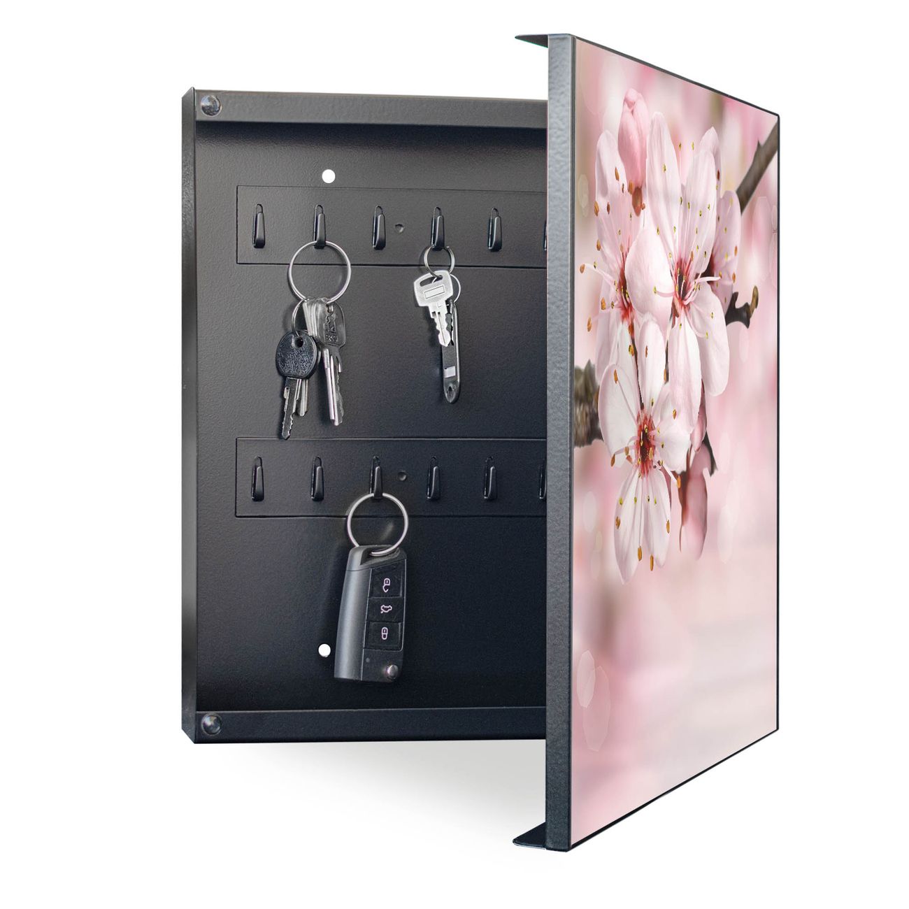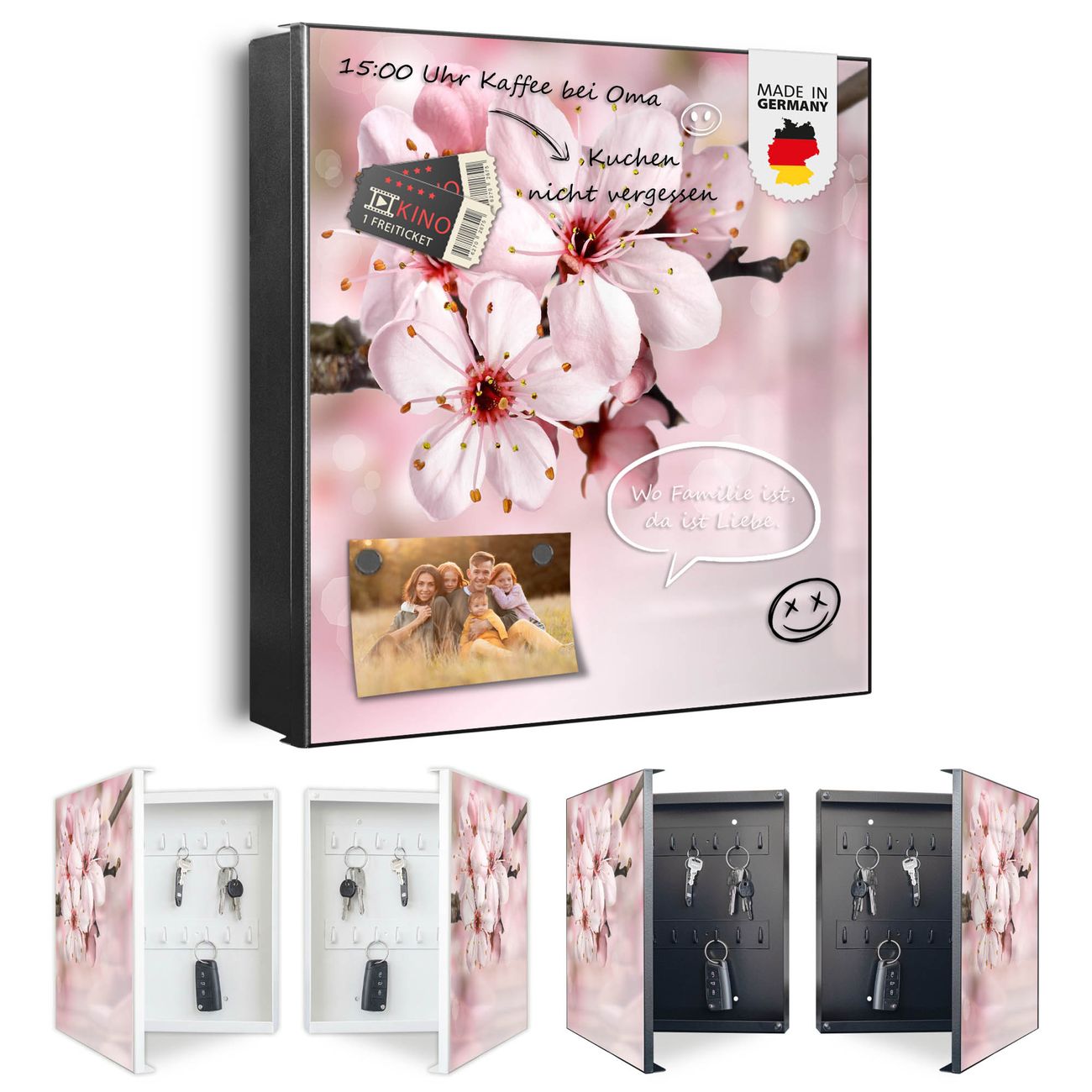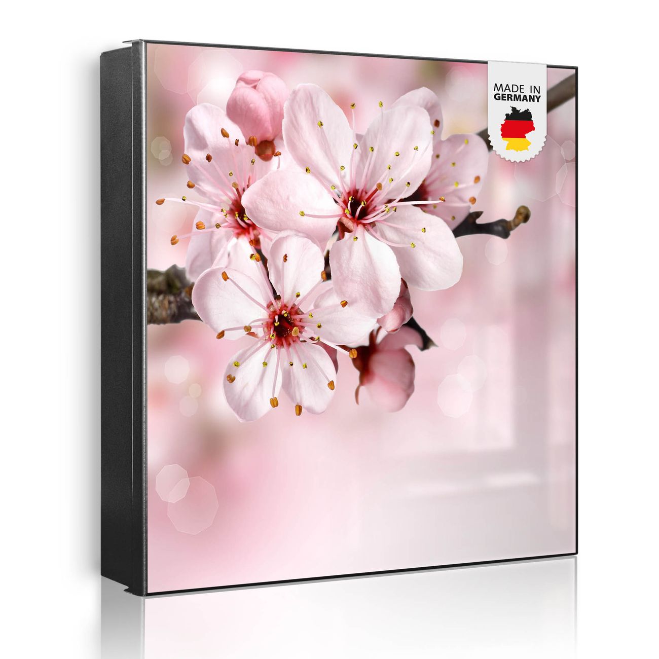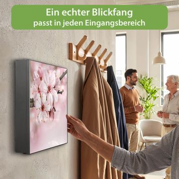 Bringe Ordnung und Eleganz in deinen Eingangsbereich mit dem banjado Schlüsselkasten Motiv Motiv Japanische Kirsche. Die moderne Schlüsselbox kombiniert funktionales Design mit hochwertiger Verarbeitung und wird so zu einem echten Hingucker in Flur, Büro oder Ferienwohnung. ✅ Stilvolle Schlüsselaufbewahrung mit Motiv Motiv Japanische Kirsche Der Design-Schlüsselkasten Motiv Motiv Japanische Kirsche bietet Platz für bis zu 32 Schlüssel, die auf 4 stabilen Reihen mit je 8 Haken übersichtlich verstaut werden. Mit seinen kompakten Maßen von 30 x 30 x 5 cm passt die Schlüsselbox perfekt auch in kleinere Räume. Der schwarz lackierte Stahlkorpus mit rechts angeschlagenem Türscharnier harmoniert mit gedruckten Folie auf der Front und fügt sich nahtlos in jedes Wohnambiente ein. Ob als Schlüsselorganizer für Zuhause oder als praktische Lösung für Büros, Praxen und Gewerbe, der banjado Schlüsselkasten sorgt für Ordnung und Übersicht. Dank der magnetischen, mit Kreidestiften beschreibbaren Folie auf der Front kannst du Notizen anheften oder Termine direkt auf der Oberfläche festhalten. Die Schlüsselbox Motiv Motiv Japanische Kirsche zur Wandmontage wird inklusive Befestigungsmaterial geliefert und ist schnell angebracht. So hast du deine Schlüssel jederzeit griffbereit und zugleich stilvoll verstaut. Mit diesem banjado Schlüsselkasten Motiv Motiv Japanische Kirsche kombinierst du praktische Aufbewahrung mit stilvollem Wohndesign. Ob privat oder geschäftlich, die Schlüsselbox sorgt für mehr Ordnung, Übersicht und ein wohnliches Ambiente.Vorteile im Überblick