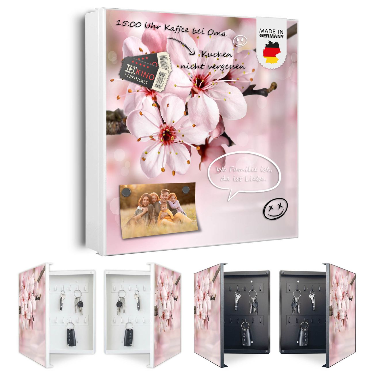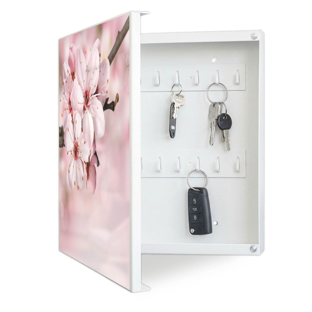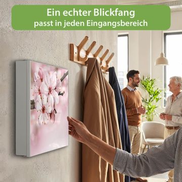 Bringe Ordnung und Eleganz in deinen Eingangsbereich mit dem banjado Schlüsselkasten Motiv Motiv Japanische Kirsche. Die moderne Schlüsselbox kombiniert funktionales Design mit hochwertiger Verarbeitung und wird so zu einem echten Hingucker in Flur, Büro oder Ferienwohnung. ✅ Stilvolle Schlüsselaufbewahrung mit Motiv Motiv Japanische Kirsche Der Design-Schlüsselkasten Motiv Motiv Japanische Kirsche bietet Platz für bis zu 32 Schlüssel, die auf 4 stabilen Reihen mit je 8 Haken übersichtlich verstaut werden. Mit seinen kompakten Maßen von 30 x 30 x 5 cm passt die Schlüsselbox perfekt auch in kleinere Räume. Der weiß lackierte Stahlkorpus mit links angeschlagenem Türscharnier harmoniert mit gedruckten Folie auf der Front und fügt sich nahtlos in jedes Wohnambiente ein. Ob als Schlüsselorganizer für Zuhause oder als praktische Lösung für Büros, Praxen und Gewerbe, der banjado Schlüsselkasten sorgt für Ordnung und Übersicht. Dank der magnetischen, mit Kreidestiften beschreibbaren Folie auf der Front kannst du Notizen anheften oder Termine direkt auf der Oberfläche festhalten. Die Schlüsselbox Motiv Motiv Japanische Kirsche zur Wandmontage wird inklusive Befestigungsmaterial geliefert und ist schnell angebracht. So hast du deine Schlüssel jederzeit griffbereit und zugleich stilvoll verstaut. Mit diesem banjado Schlüsselkasten Motiv Motiv Japanische Kirsche kombinierst du praktische Aufbewahrung mit stilvollem Wohndesign. Ob privat oder geschäftlich, die Schlüsselbox sorgt für mehr Ordnung, Übersicht und ein wohnliches Ambiente.Vorteile im Überblick