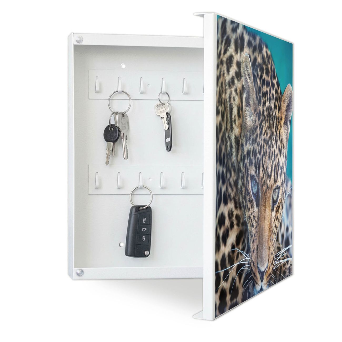 Bringe Ordnung und Eleganz in deinen Eingangsbereich mit dem banjado Schlüsselkasten Motiv Motiv Jarmilla. Die moderne Schlüsselbox kombiniert funktionales Design mit hochwertiger Verarbeitung und wird so zu einem echten Hingucker in Flur, Büro oder Ferienwohnung. ✅ Stilvolle Schlüsselaufbewahrung mit Motiv Motiv Jarmilla Der Design-Schlüsselkasten Motiv Motiv Jarmilla bietet Platz für bis zu 32 Schlüssel, die auf 4 stabilen Reihen mit je 8 Haken übersichtlich verstaut werden. Mit seinen kompakten Maßen von 30 x 30 x 5 cm passt die Schlüsselbox perfekt auch in kleinere Räume. Der weiß lackierte Stahlkorpus mit rechts angeschlagenem Türscharnier harmoniert mit gedruckten Folie auf der Front und fügt sich nahtlos in jedes Wohnambiente ein. Ob als Schlüsselorganizer für Zuhause oder als praktische Lösung für Büros, Praxen und Gewerbe, der banjado Schlüsselkasten sorgt für Ordnung und Übersicht. Dank der magnetischen, mit Kreidestiften beschreibbaren Folie auf der Front kannst du Notizen anheften oder Termine direkt auf der Oberfläche festhalten. Die Schlüsselbox Motiv Motiv Jarmilla zur Wandmontage wird inklusive Befestigungsmaterial geliefert und ist schnell angebracht. So hast du deine Schlüssel jederzeit griffbereit und zugleich stilvoll verstaut. Mit diesem banjado Schlüsselkasten Motiv Motiv Jarmilla kombinierst du praktische Aufbewahrung mit stilvollem Wohndesign. Ob privat oder geschäftlich, die Schlüsselbox sorgt für mehr Ordnung, Übersicht und ein wohnliches Ambiente.Vorteile im Überblick