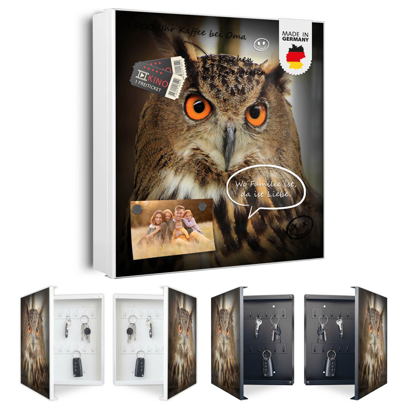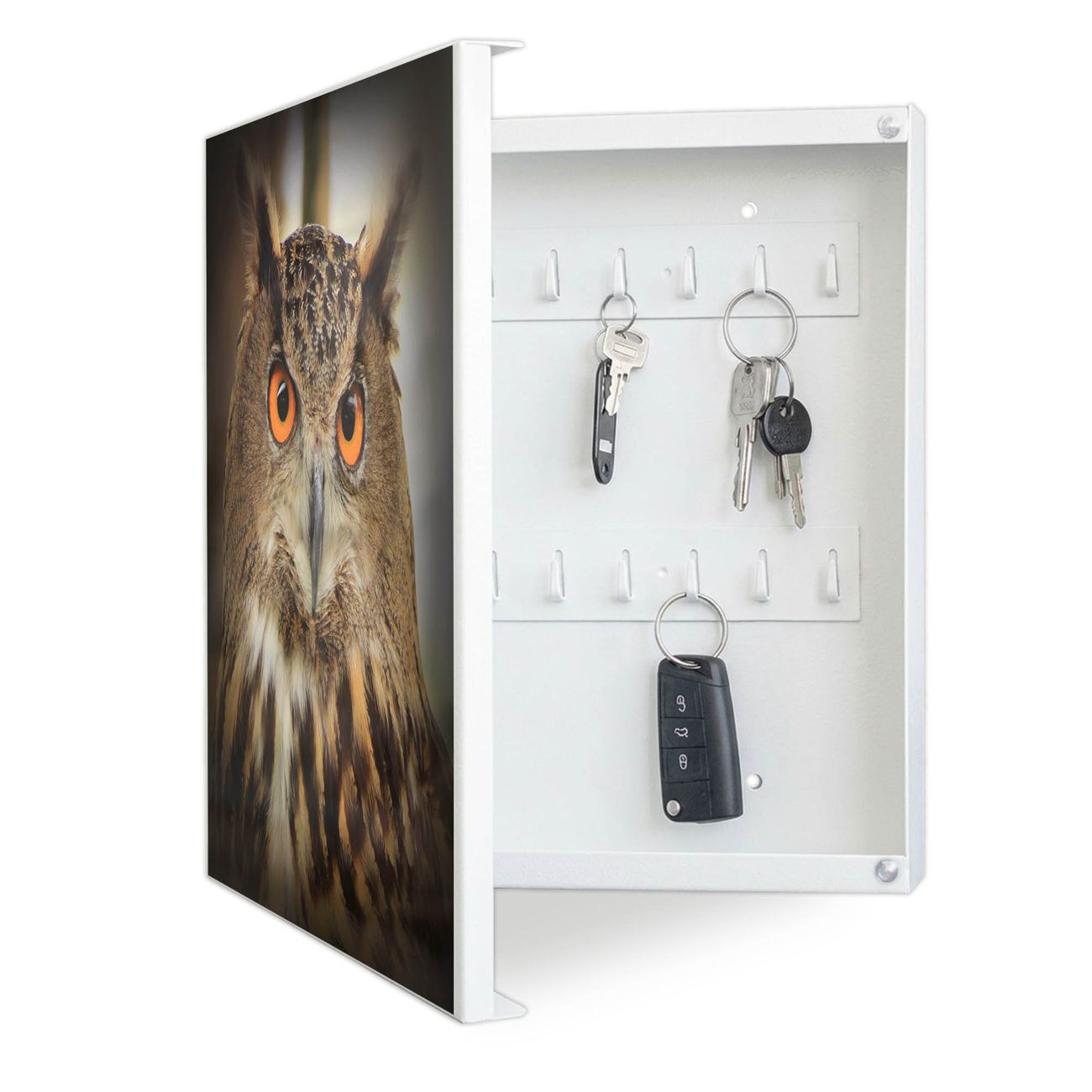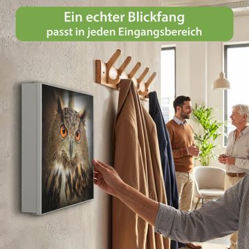 Bringe Ordnung und Eleganz in deinen Eingangsbereich mit dem banjado Schlüsselkasten Motiv Motiv Judy. Die moderne Schlüsselbox kombiniert funktionales Design mit hochwertiger Verarbeitung und wird so zu einem echten Hingucker in Flur, Büro oder Ferienwohnung. ✅ Stilvolle Schlüsselaufbewahrung mit Motiv Motiv Judy Der Design-Schlüsselkasten Motiv Motiv Judy bietet Platz für bis zu 32 Schlüssel, die auf 4 stabilen Reihen mit je 8 Haken übersichtlich verstaut werden. Mit seinen kompakten Maßen von 30 x 30 x 5 cm passt die Schlüsselbox perfekt auch in kleinere Räume. Der weiß lackierte Stahlkorpus mit links angeschlagenem Türscharnier harmoniert mit gedruckten Folie auf der Front und fügt sich nahtlos in jedes Wohnambiente ein. Ob als Schlüsselorganizer für Zuhause oder als praktische Lösung für Büros, Praxen und Gewerbe, der banjado Schlüsselkasten sorgt für Ordnung und Übersicht. Dank der magnetischen, mit Kreidestiften beschreibbaren Folie auf der Front kannst du Notizen anheften oder Termine direkt auf der Oberfläche festhalten. Die Schlüsselbox Motiv Motiv Judy zur Wandmontage wird inklusive Befestigungsmaterial geliefert und ist schnell angebracht. So hast du deine Schlüssel jederzeit griffbereit und zugleich stilvoll verstaut. Mit diesem banjado Schlüsselkasten Motiv Motiv Judy kombinierst du praktische Aufbewahrung mit stilvollem Wohndesign. Ob privat oder geschäftlich, die Schlüsselbox sorgt für mehr Ordnung, Übersicht und ein wohnliches Ambiente.Vorteile im Überblick