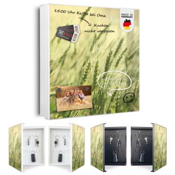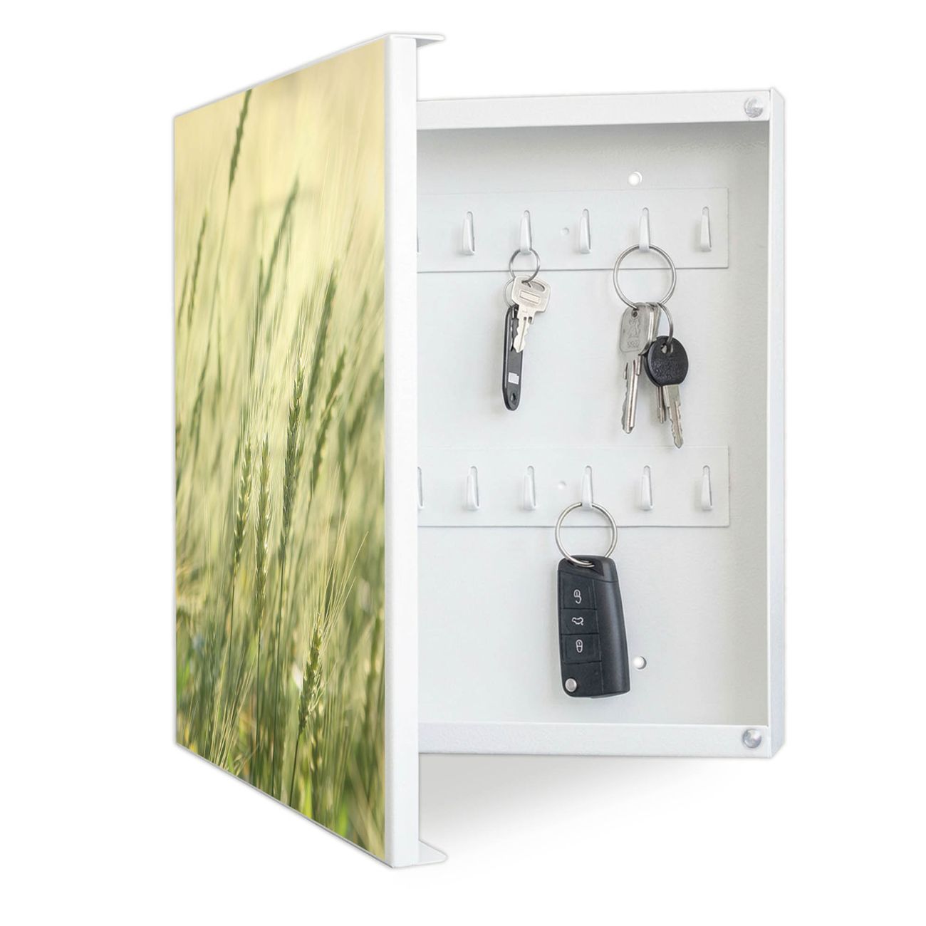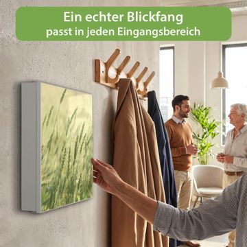 Bringe Ordnung und Eleganz in deinen Eingangsbereich mit dem banjado Schlüsselkasten Motiv Motiv Junges Getreide. Die moderne Schlüsselbox kombiniert funktionales Design mit hochwertiger Verarbeitung und wird so zu einem echten Hingucker in Flur, Büro oder Ferienwohnung. ✅ Stilvolle Schlüsselaufbewahrung mit Motiv Motiv Junges Getreide Der Design-Schlüsselkasten Motiv Motiv Junges Getreide bietet Platz für bis zu 32 Schlüssel, die auf 4 stabilen Reihen mit je 8 Haken übersichtlich verstaut werden. Mit seinen kompakten Maßen von 30 x 30 x 5 cm passt die Schlüsselbox perfekt auch in kleinere Räume. Der weiß lackierte Stahlkorpus mit links angeschlagenem Türscharnier harmoniert mit gedruckten Folie auf der Front und fügt sich nahtlos in jedes Wohnambiente ein. Ob als Schlüsselorganizer für Zuhause oder als praktische Lösung für Büros, Praxen und Gewerbe, der banjado Schlüsselkasten sorgt für Ordnung und Übersicht. Dank der magnetischen, mit Kreidestiften beschreibbaren Folie auf der Front kannst du Notizen anheften oder Termine direkt auf der Oberfläche festhalten. Die Schlüsselbox Motiv Motiv Junges Getreide zur Wandmontage wird inklusive Befestigungsmaterial geliefert und ist schnell angebracht. So hast du deine Schlüssel jederzeit griffbereit und zugleich stilvoll verstaut. Mit diesem banjado Schlüsselkasten Motiv Motiv Junges Getreide kombinierst du praktische Aufbewahrung mit stilvollem Wohndesign. Ob privat oder geschäftlich, die Schlüsselbox sorgt für mehr Ordnung, Übersicht und ein wohnliches Ambiente.Vorteile im Überblick