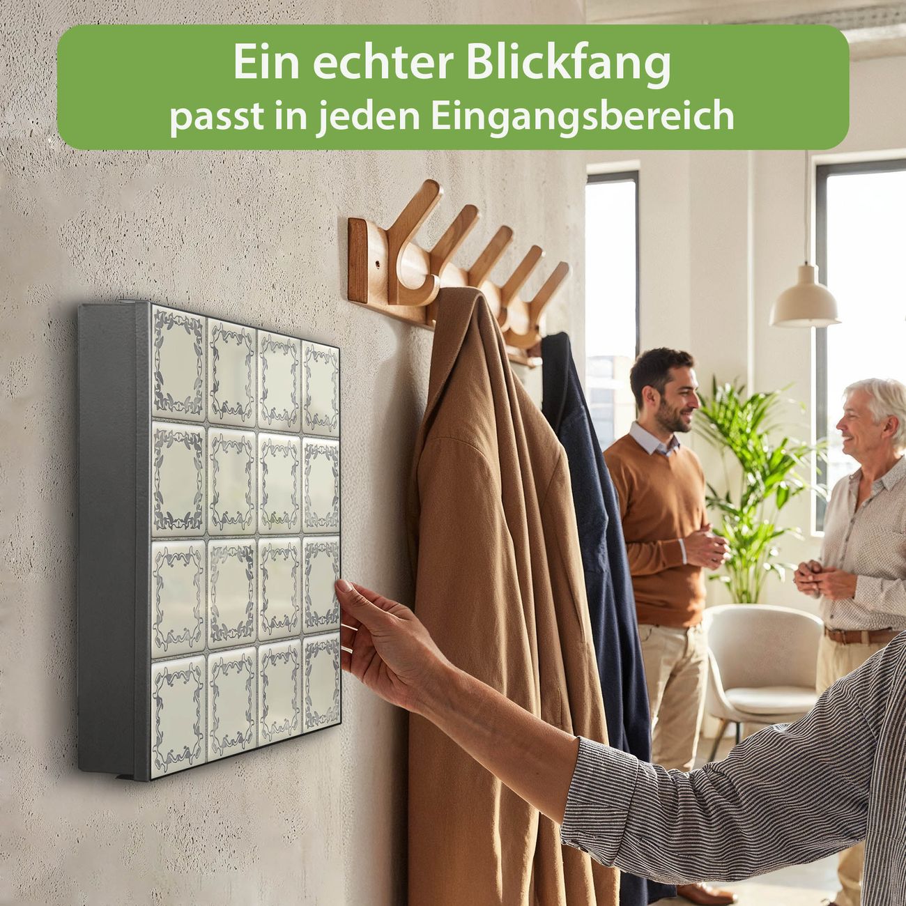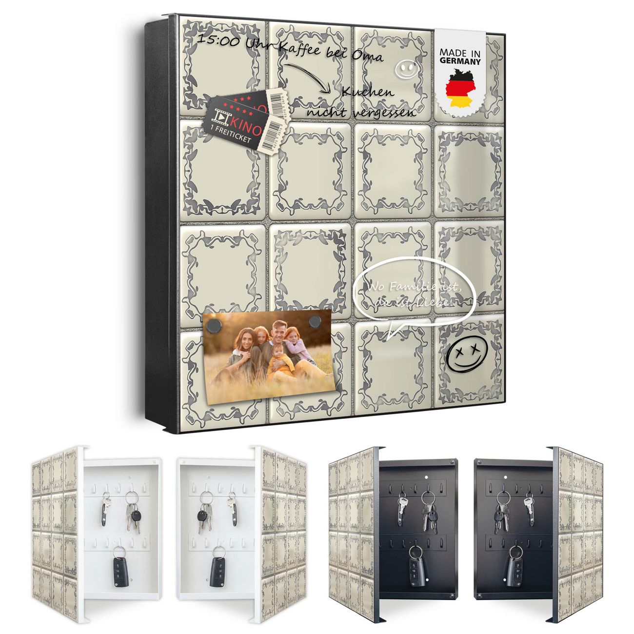 Bringe Ordnung und Eleganz in deinen Eingangsbereich mit dem banjado Schlüsselkasten Motiv Motiv Kacheln. Die moderne Schlüsselbox kombiniert funktionales Design mit hochwertiger Verarbeitung und wird so zu einem echten Hingucker in Flur, Büro oder Ferienwohnung. ✅ Stilvolle Schlüsselaufbewahrung mit Motiv Motiv Kacheln Der Design-Schlüsselkasten Motiv Motiv Kacheln bietet Platz für bis zu 32 Schlüssel, die auf 4 stabilen Reihen mit je 8 Haken übersichtlich verstaut werden. Mit seinen kompakten Maßen von 30 x 30 x 5 cm passt die Schlüsselbox perfekt auch in kleinere Räume. Der schwarz lackierte Stahlkorpus mit rechts angeschlagenem Türscharnier harmoniert mit gedruckten Folie auf der Front und fügt sich nahtlos in jedes Wohnambiente ein. Ob als Schlüsselorganizer für Zuhause oder als praktische Lösung für Büros, Praxen und Gewerbe, der banjado Schlüsselkasten sorgt für Ordnung und Übersicht. Dank der magnetischen, mit Kreidestiften beschreibbaren Folie auf der Front kannst du Notizen anheften oder Termine direkt auf der Oberfläche festhalten. Die Schlüsselbox Motiv Motiv Kacheln zur Wandmontage wird inklusive Befestigungsmaterial geliefert und ist schnell angebracht. So hast du deine Schlüssel jederzeit griffbereit und zugleich stilvoll verstaut. Mit diesem banjado Schlüsselkasten Motiv Motiv Kacheln kombinierst du praktische Aufbewahrung mit stilvollem Wohndesign. Ob privat oder geschäftlich, die Schlüsselbox sorgt für mehr Ordnung, Übersicht und ein wohnliches Ambiente.Vorteile im Überblick