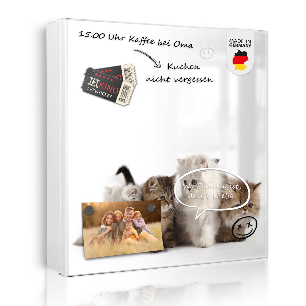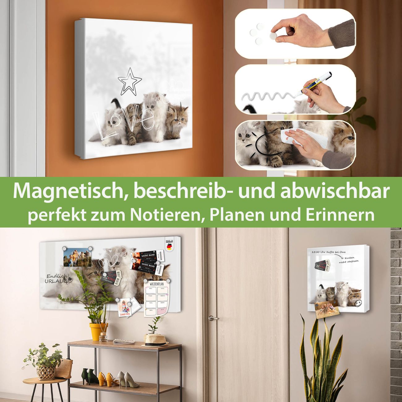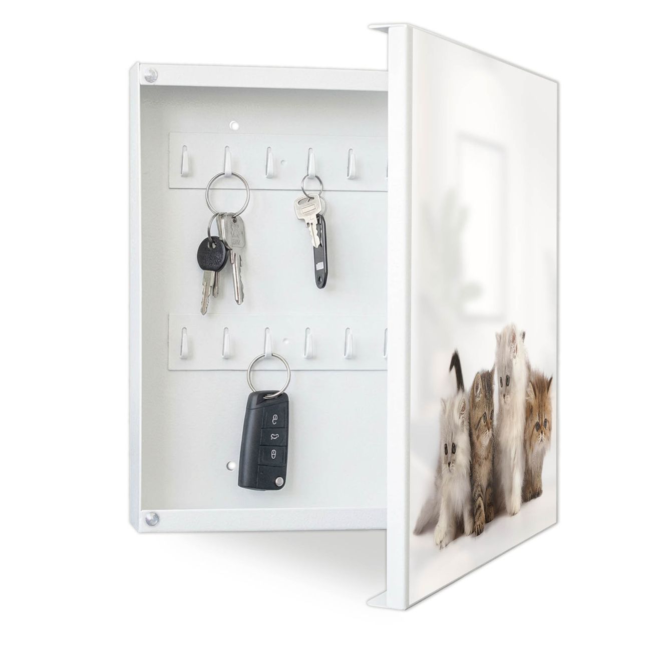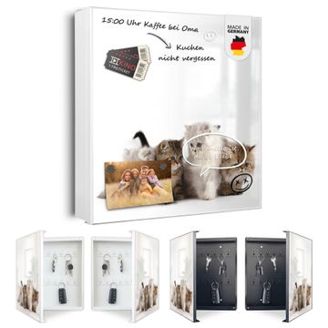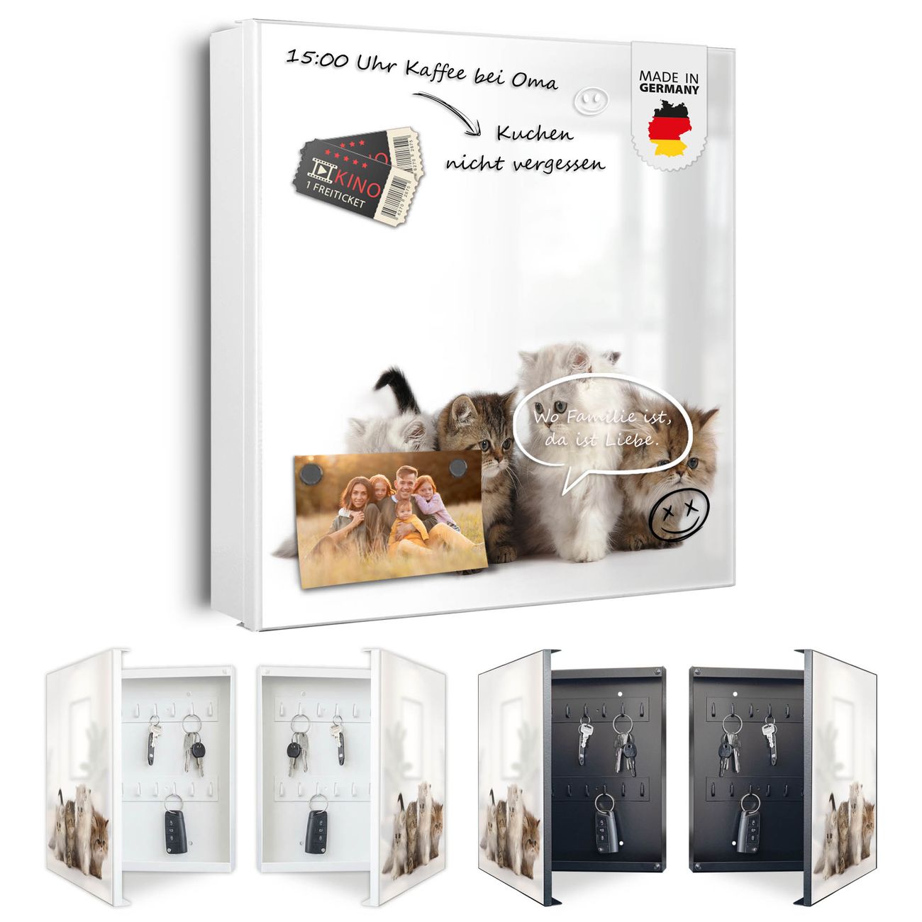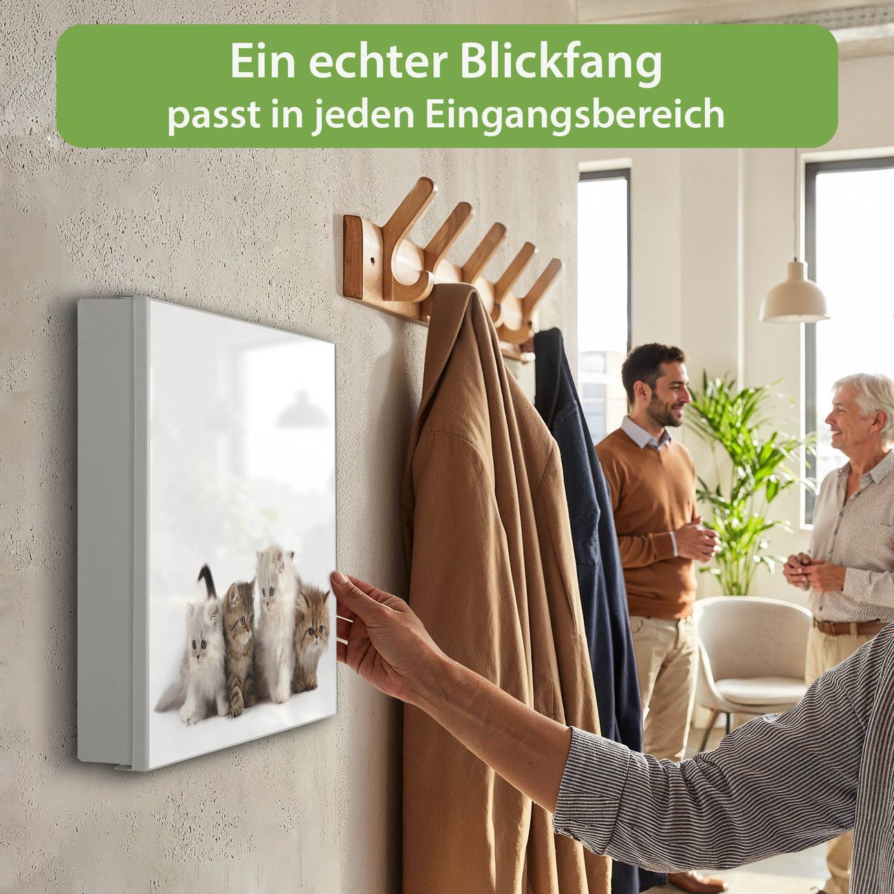 Bringe Ordnung und Eleganz in deinen Eingangsbereich mit dem banjado Schlüsselkasten Motiv Motiv Kaetzchen. Die moderne Schlüsselbox kombiniert funktionales Design mit hochwertiger Verarbeitung und wird so zu einem echten Hingucker in Flur, Büro oder Ferienwohnung. ✅ Stilvolle Schlüsselaufbewahrung mit Motiv Motiv Kaetzchen Der Design-Schlüsselkasten Motiv Motiv Kaetzchen bietet Platz für bis zu 32 Schlüssel, die auf 4 stabilen Reihen mit je 8 Haken übersichtlich verstaut werden. Mit seinen kompakten Maßen von 30 x 30 x 5 cm passt die Schlüsselbox perfekt auch in kleinere Räume. Der weiß lackierte Stahlkorpus mit rechts angeschlagenem Türscharnier harmoniert mit gedruckten Folie auf der Front und fügt sich nahtlos in jedes Wohnambiente ein. Ob als Schlüsselorganizer für Zuhause oder als praktische Lösung für Büros, Praxen und Gewerbe, der banjado Schlüsselkasten sorgt für Ordnung und Übersicht. Dank der magnetischen, mit Kreidestiften beschreibbaren Folie auf der Front kannst du Notizen anheften oder Termine direkt auf der Oberfläche festhalten. Die Schlüsselbox Motiv Motiv Kaetzchen zur Wandmontage wird inklusive Befestigungsmaterial geliefert und ist schnell angebracht. So hast du deine Schlüssel jederzeit griffbereit und zugleich stilvoll verstaut. Mit diesem banjado Schlüsselkasten Motiv Motiv Kaetzchen kombinierst du praktische Aufbewahrung mit stilvollem Wohndesign. Ob privat oder geschäftlich, die Schlüsselbox sorgt für mehr Ordnung, Übersicht und ein wohnliches Ambiente.Vorteile im Überblick