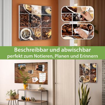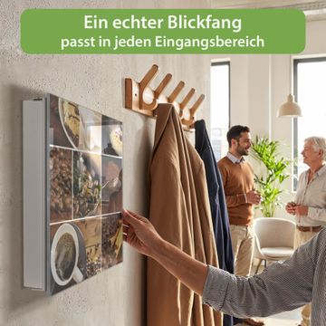 Bringe Ordnung und Eleganz in deinen Eingangsbereich mit dem banjado Schlüsselkasten Motiv Motiv Kaffee&Schokolade. Die moderne Schlüsselbox kombiniert funktionales Design mit hochwertiger Verarbeitung und wird so zu einem echten Hingucker in Flur, Büro oder Ferienwohnung. ✅ Stilvolle Schlüsselaufbewahrung mit Glasfront im Motiv Motiv Kaffee&Schokolade Der Design-Schlüsselkasten Motiv Motiv Kaffee&Schokolade bietet Platz für bis zu 50 Schlüssel, die auf 5 stabilen Reihen mit je 10 Haken übersichtlich verstaut werden. Mit seinen kompakten Maßen von 30 x 30 x 5 cm passt die Schlüsselbox perfekt auch in kleinere Räume. Der weiß lackierte Stahlkorpus mit rechts angeschlagenem Türscharnier harmoniert mit der Glasfront und fügt sich nahtlos in jedes Wohnambiente ein. Ob als Schlüsselorganizer für Zuhause oder als praktische Lösung für Büros, Praxen und Gewerbe, der banjado Schlüsselkasten sorgt für Ordnung und Übersicht. Dank der magnetischen, mit Kreidestiften beschreibbaren Glasfront kannst du Notizen anheften oder Termine direkt auf der Oberfläche festhalten. Die Schlüsselbox Motiv Motiv Kaffee&Schokolade zur Wandmontage wird inklusive Befestigungsmaterial geliefert und ist schnell angebracht. So hast du deine Schlüssel jederzeit griffbereit und zugleich stilvoll verstaut. Mit diesem banjado Schlüsselkasten Motiv Motiv Kaffee&Schokolade kombinierst du praktische Aufbewahrung mit stilvollem Wohndesign. Ob privat oder geschäftlich, die Schlüsselbox sorgt für mehr Ordnung, Übersicht und ein wohnliches Ambiente.Vorteile im Überblick