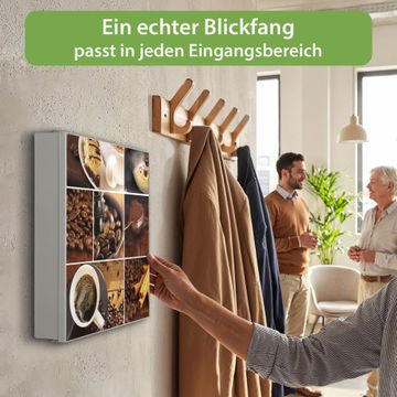 Bringe Ordnung und Eleganz in deinen Eingangsbereich mit dem banjado Schlüsselkasten Motiv Motiv Kaffee&Schokolade. Die moderne Schlüsselbox kombiniert funktionales Design mit hochwertiger Verarbeitung und wird so zu einem echten Hingucker in Flur, Büro oder Ferienwohnung. ✅ Stilvolle Schlüsselaufbewahrung mit Motiv Motiv Kaffee&Schokolade Der Design-Schlüsselkasten Motiv Motiv Kaffee&Schokolade bietet Platz für bis zu 32 Schlüssel, die auf 4 stabilen Reihen mit je 8 Haken übersichtlich verstaut werden. Mit seinen kompakten Maßen von 30 x 30 x 5 cm passt die Schlüsselbox perfekt auch in kleinere Räume. Der weiß lackierte Stahlkorpus mit links angeschlagenem Türscharnier harmoniert mit gedruckten Folie auf der Front und fügt sich nahtlos in jedes Wohnambiente ein. Ob als Schlüsselorganizer für Zuhause oder als praktische Lösung für Büros, Praxen und Gewerbe, der banjado Schlüsselkasten sorgt für Ordnung und Übersicht. Dank der magnetischen, mit Kreidestiften beschreibbaren Folie auf der Front kannst du Notizen anheften oder Termine direkt auf der Oberfläche festhalten. Die Schlüsselbox Motiv Motiv Kaffee&Schokolade zur Wandmontage wird inklusive Befestigungsmaterial geliefert und ist schnell angebracht. So hast du deine Schlüssel jederzeit griffbereit und zugleich stilvoll verstaut. Mit diesem banjado Schlüsselkasten Motiv Motiv Kaffee&Schokolade kombinierst du praktische Aufbewahrung mit stilvollem Wohndesign. Ob privat oder geschäftlich, die Schlüsselbox sorgt für mehr Ordnung, Übersicht und ein wohnliches Ambiente.Vorteile im Überblick