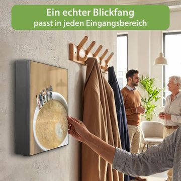 Bringe Ordnung und Eleganz in deinen Eingangsbereich mit dem banjado Schlüsselkasten Motiv Motiv Kaffeepause. Die moderne Schlüsselbox kombiniert funktionales Design mit hochwertiger Verarbeitung und wird so zu einem echten Hingucker in Flur, Büro oder Ferienwohnung. ✅ Stilvolle Schlüsselaufbewahrung mit Motiv Motiv Kaffeepause Der Design-Schlüsselkasten Motiv Motiv Kaffeepause bietet Platz für bis zu 32 Schlüssel, die auf 4 stabilen Reihen mit je 8 Haken übersichtlich verstaut werden. Mit seinen kompakten Maßen von 30 x 30 x 5 cm passt die Schlüsselbox perfekt auch in kleinere Räume. Der schwarz lackierte Stahlkorpus mit links angeschlagenem Türscharnier harmoniert mit gedruckten Folie auf der Front und fügt sich nahtlos in jedes Wohnambiente ein. Ob als Schlüsselorganizer für Zuhause oder als praktische Lösung für Büros, Praxen und Gewerbe, der banjado Schlüsselkasten sorgt für Ordnung und Übersicht. Dank der magnetischen, mit Kreidestiften beschreibbaren Folie auf der Front kannst du Notizen anheften oder Termine direkt auf der Oberfläche festhalten. Die Schlüsselbox Motiv Motiv Kaffeepause zur Wandmontage wird inklusive Befestigungsmaterial geliefert und ist schnell angebracht. So hast du deine Schlüssel jederzeit griffbereit und zugleich stilvoll verstaut. Mit diesem banjado Schlüsselkasten Motiv Motiv Kaffeepause kombinierst du praktische Aufbewahrung mit stilvollem Wohndesign. Ob privat oder geschäftlich, die Schlüsselbox sorgt für mehr Ordnung, Übersicht und ein wohnliches Ambiente.Vorteile im Überblick