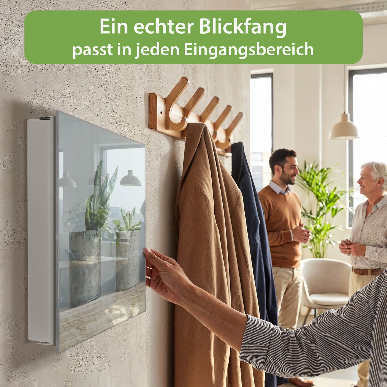 Bringe Ordnung und Eleganz in deinen Eingangsbereich mit dem banjado Schlüsselkasten Motiv Motiv Kakteen in Beton. Die moderne Schlüsselbox kombiniert funktionales Design mit hochwertiger Verarbeitung und wird so zu einem echten Hingucker in Flur, Büro oder Ferienwohnung. ✅ Stilvolle Schlüsselaufbewahrung mit Glasfront im Motiv Motiv Kakteen in Beton Der Design-Schlüsselkasten Motiv Motiv Kakteen in Beton bietet Platz für bis zu 50 Schlüssel, die auf 5 stabilen Reihen mit je 10 Haken übersichtlich verstaut werden. Mit seinen kompakten Maßen von 30 x 30 x 5 cm passt die Schlüsselbox perfekt auch in kleinere Räume. Der weiß lackierte Stahlkorpus mit rechts angeschlagenem Türscharnier harmoniert mit der Glasfront und fügt sich nahtlos in jedes Wohnambiente ein. Ob als Schlüsselorganizer für Zuhause oder als praktische Lösung für Büros, Praxen und Gewerbe, der banjado Schlüsselkasten sorgt für Ordnung und Übersicht. Dank der magnetischen, mit Kreidestiften beschreibbaren Glasfront kannst du Notizen anheften oder Termine direkt auf der Oberfläche festhalten. Die Schlüsselbox Motiv Motiv Kakteen in Beton zur Wandmontage wird inklusive Befestigungsmaterial geliefert und ist schnell angebracht. So hast du deine Schlüssel jederzeit griffbereit und zugleich stilvoll verstaut. Mit diesem banjado Schlüsselkasten Motiv Motiv Kakteen in Beton kombinierst du praktische Aufbewahrung mit stilvollem Wohndesign. Ob privat oder geschäftlich, die Schlüsselbox sorgt für mehr Ordnung, Übersicht und ein wohnliches Ambiente.Vorteile im Überblick