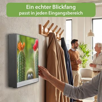 Bringe Ordnung und Eleganz in deinen Eingangsbereich mit dem banjado Schlüsselkasten Motiv Motiv Kakteen. Die moderne Schlüsselbox kombiniert funktionales Design mit hochwertiger Verarbeitung und wird so zu einem echten Hingucker in Flur, Büro oder Ferienwohnung. ✅ Stilvolle Schlüsselaufbewahrung mit Motiv Motiv Kakteen Der Design-Schlüsselkasten Motiv Motiv Kakteen bietet Platz für bis zu 32 Schlüssel, die auf 4 stabilen Reihen mit je 8 Haken übersichtlich verstaut werden. Mit seinen kompakten Maßen von 30 x 30 x 5 cm passt die Schlüsselbox perfekt auch in kleinere Räume. Der schwarz lackierte Stahlkorpus mit rechts angeschlagenem Türscharnier harmoniert mit gedruckten Folie auf der Front und fügt sich nahtlos in jedes Wohnambiente ein. Ob als Schlüsselorganizer für Zuhause oder als praktische Lösung für Büros, Praxen und Gewerbe, der banjado Schlüsselkasten sorgt für Ordnung und Übersicht. Dank der magnetischen, mit Kreidestiften beschreibbaren Folie auf der Front kannst du Notizen anheften oder Termine direkt auf der Oberfläche festhalten. Die Schlüsselbox Motiv Motiv Kakteen zur Wandmontage wird inklusive Befestigungsmaterial geliefert und ist schnell angebracht. So hast du deine Schlüssel jederzeit griffbereit und zugleich stilvoll verstaut. Mit diesem banjado Schlüsselkasten Motiv Motiv Kakteen kombinierst du praktische Aufbewahrung mit stilvollem Wohndesign. Ob privat oder geschäftlich, die Schlüsselbox sorgt für mehr Ordnung, Übersicht und ein wohnliches Ambiente.Vorteile im Überblick