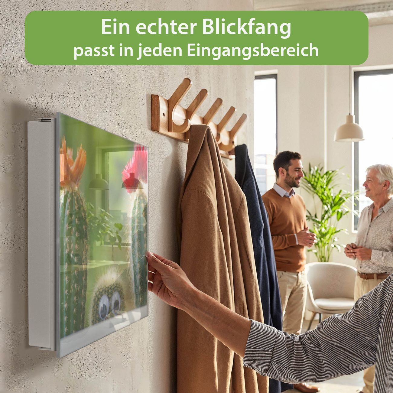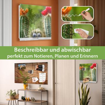 Bringe Ordnung und Eleganz in deinen Eingangsbereich mit dem banjado Schlüsselkasten Motiv Motiv Kakteen. Die moderne Schlüsselbox kombiniert funktionales Design mit hochwertiger Verarbeitung und wird so zu einem echten Hingucker in Flur, Büro oder Ferienwohnung. ✅ Stilvolle Schlüsselaufbewahrung mit Glasfront im Motiv Motiv Kakteen Der Design-Schlüsselkasten Motiv Motiv Kakteen bietet Platz für bis zu 50 Schlüssel, die auf 5 stabilen Reihen mit je 10 Haken übersichtlich verstaut werden. Mit seinen kompakten Maßen von 30 x 30 x 5 cm passt die Schlüsselbox perfekt auch in kleinere Räume. Der weiß lackierte Stahlkorpus mit rechts angeschlagenem Türscharnier harmoniert mit der Glasfront und fügt sich nahtlos in jedes Wohnambiente ein. Ob als Schlüsselorganizer für Zuhause oder als praktische Lösung für Büros, Praxen und Gewerbe, der banjado Schlüsselkasten sorgt für Ordnung und Übersicht. Dank der magnetischen, mit Kreidestiften beschreibbaren Glasfront kannst du Notizen anheften oder Termine direkt auf der Oberfläche festhalten. Die Schlüsselbox Motiv Motiv Kakteen zur Wandmontage wird inklusive Befestigungsmaterial geliefert und ist schnell angebracht. So hast du deine Schlüssel jederzeit griffbereit und zugleich stilvoll verstaut. Mit diesem banjado Schlüsselkasten Motiv Motiv Kakteen kombinierst du praktische Aufbewahrung mit stilvollem Wohndesign. Ob privat oder geschäftlich, die Schlüsselbox sorgt für mehr Ordnung, Übersicht und ein wohnliches Ambiente.Vorteile im Überblick