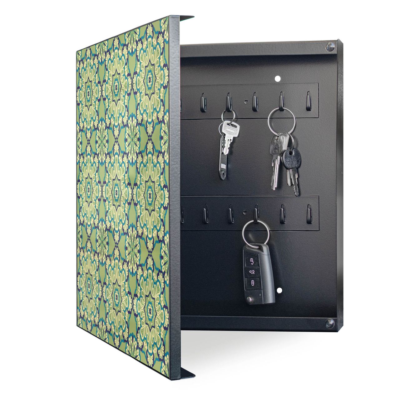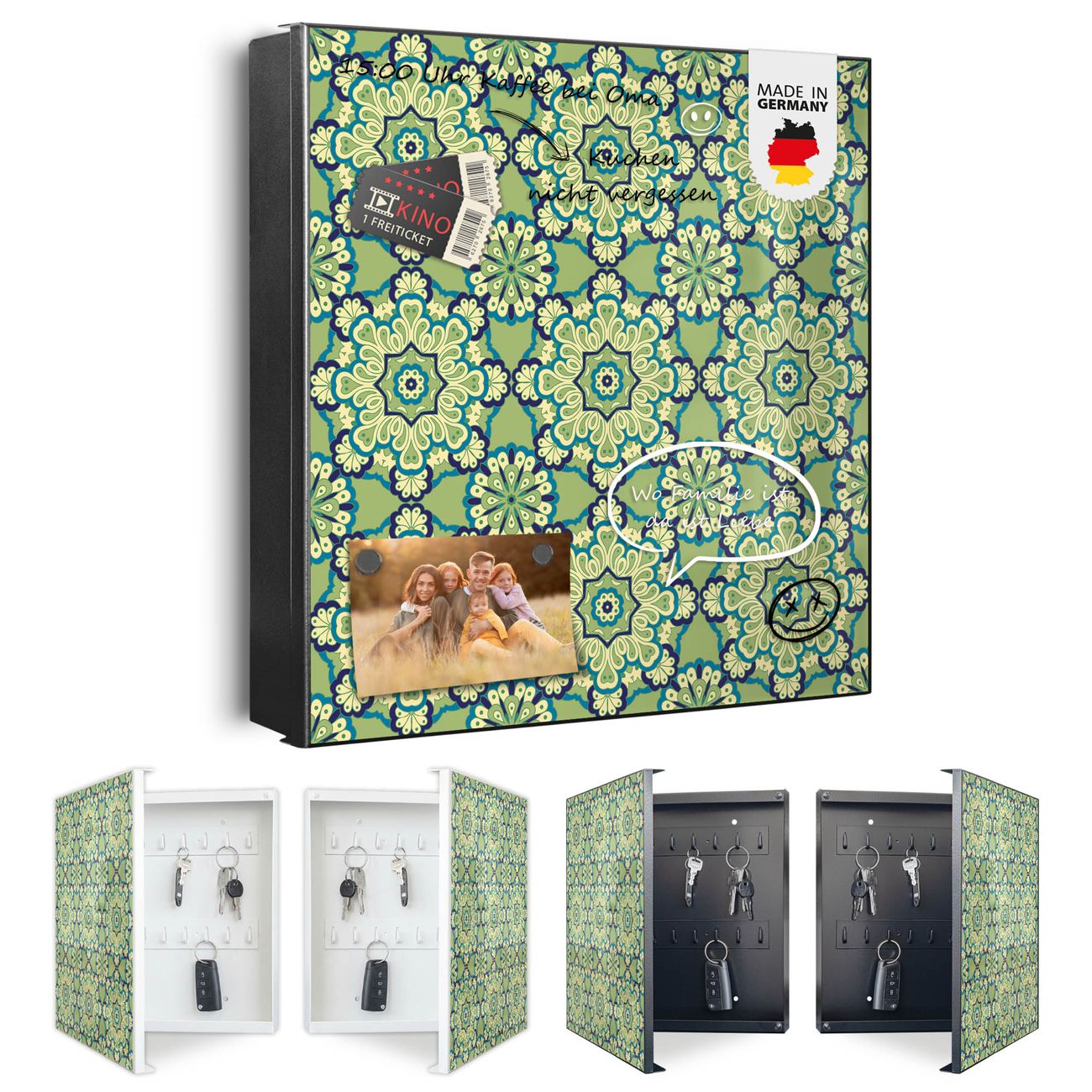 Bringe Ordnung und Eleganz in deinen Eingangsbereich mit dem banjado Schlüsselkasten Motiv Motiv Kaleidoscop Grün. Die moderne Schlüsselbox kombiniert funktionales Design mit hochwertiger Verarbeitung und wird so zu einem echten Hingucker in Flur, Büro oder Ferienwohnung. ✅ Stilvolle Schlüsselaufbewahrung mit Motiv Motiv Kaleidoscop Grün Der Design-Schlüsselkasten Motiv Motiv Kaleidoscop Grün bietet Platz für bis zu 32 Schlüssel, die auf 4 stabilen Reihen mit je 8 Haken übersichtlich verstaut werden. Mit seinen kompakten Maßen von 30 x 30 x 5 cm passt die Schlüsselbox perfekt auch in kleinere Räume. Der schwarz lackierte Stahlkorpus mit links angeschlagenem Türscharnier harmoniert mit gedruckten Folie auf der Front und fügt sich nahtlos in jedes Wohnambiente ein. Ob als Schlüsselorganizer für Zuhause oder als praktische Lösung für Büros, Praxen und Gewerbe, der banjado Schlüsselkasten sorgt für Ordnung und Übersicht. Dank der magnetischen, mit Kreidestiften beschreibbaren Folie auf der Front kannst du Notizen anheften oder Termine direkt auf der Oberfläche festhalten. Die Schlüsselbox Motiv Motiv Kaleidoscop Grün zur Wandmontage wird inklusive Befestigungsmaterial geliefert und ist schnell angebracht. So hast du deine Schlüssel jederzeit griffbereit und zugleich stilvoll verstaut. Mit diesem banjado Schlüsselkasten Motiv Motiv Kaleidoscop Grün kombinierst du praktische Aufbewahrung mit stilvollem Wohndesign. Ob privat oder geschäftlich, die Schlüsselbox sorgt für mehr Ordnung, Übersicht und ein wohnliches Ambiente.Vorteile im Überblick