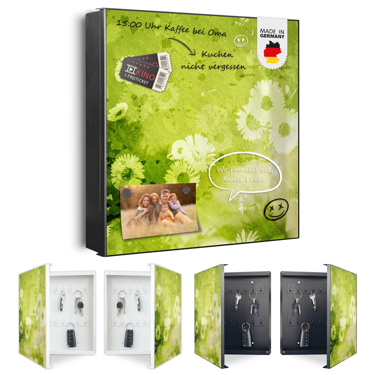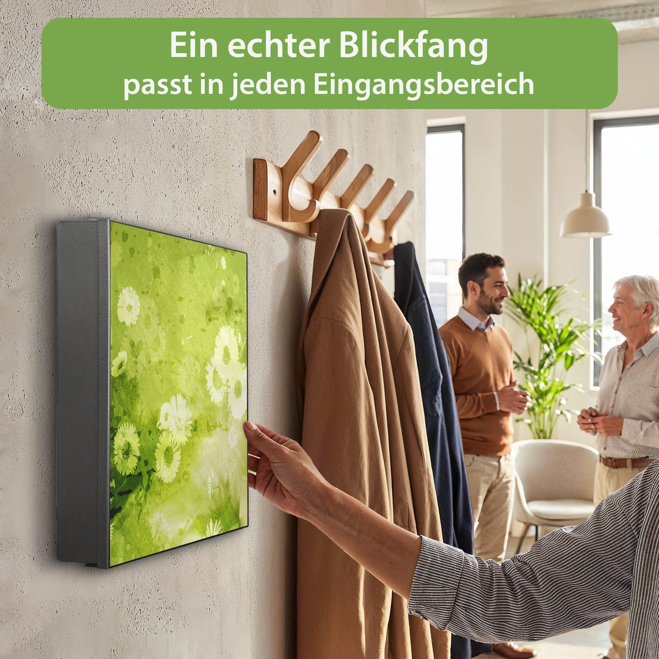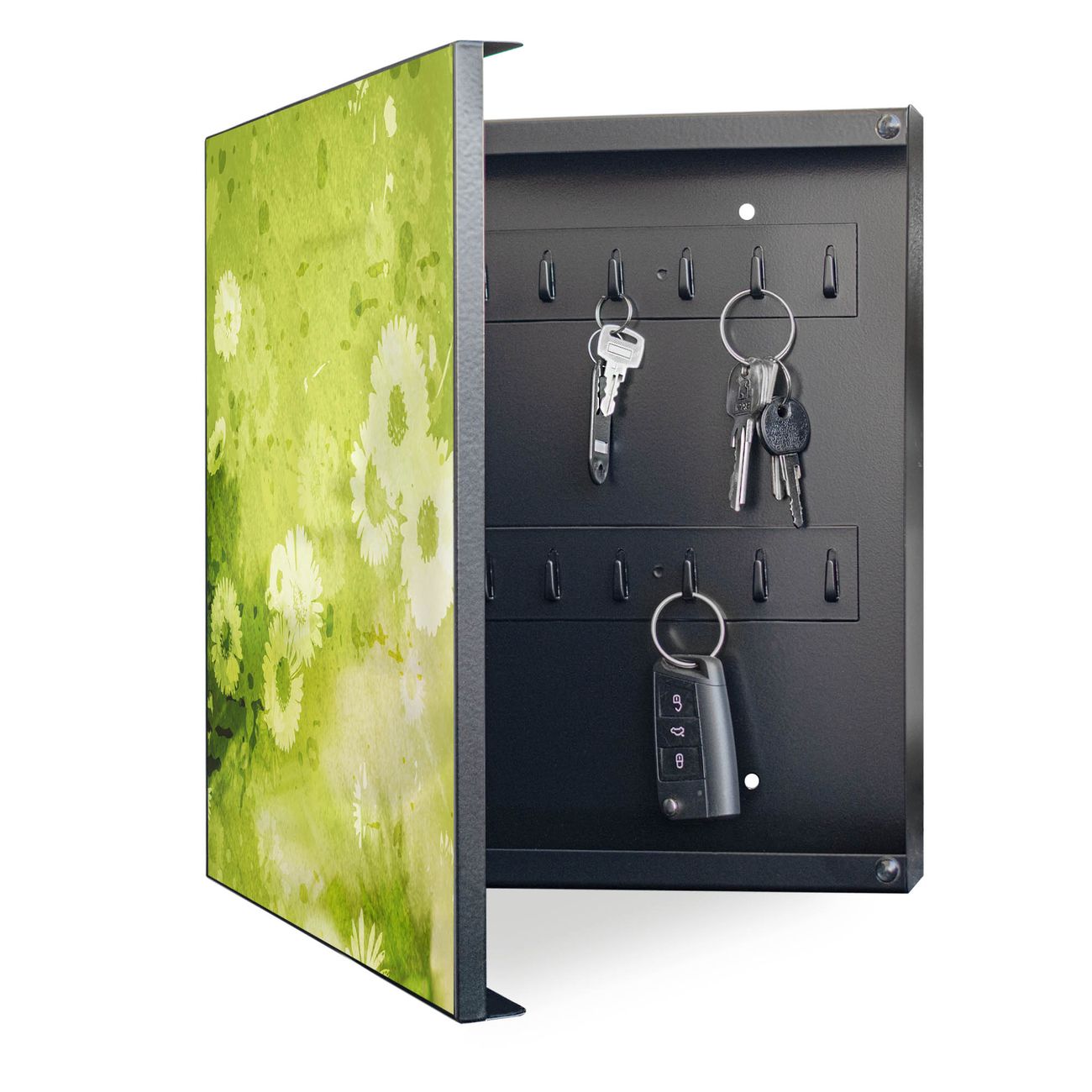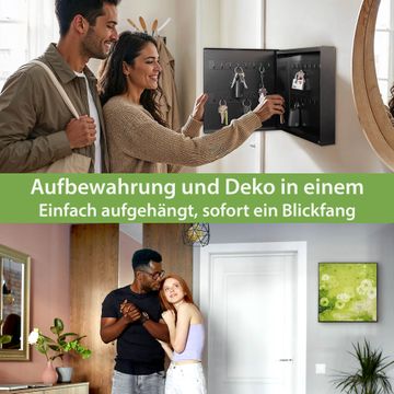 Bringe Ordnung und Eleganz in deinen Eingangsbereich mit dem banjado Schlüsselkasten Motiv Motiv Kamille Grün. Die moderne Schlüsselbox kombiniert funktionales Design mit hochwertiger Verarbeitung und wird so zu einem echten Hingucker in Flur, Büro oder Ferienwohnung. ✅ Stilvolle Schlüsselaufbewahrung mit Motiv Motiv Kamille Grün Der Design-Schlüsselkasten Motiv Motiv Kamille Grün bietet Platz für bis zu 32 Schlüssel, die auf 4 stabilen Reihen mit je 8 Haken übersichtlich verstaut werden. Mit seinen kompakten Maßen von 30 x 30 x 5 cm passt die Schlüsselbox perfekt auch in kleinere Räume. Der schwarz lackierte Stahlkorpus mit links angeschlagenem Türscharnier harmoniert mit gedruckten Folie auf der Front und fügt sich nahtlos in jedes Wohnambiente ein. Ob als Schlüsselorganizer für Zuhause oder als praktische Lösung für Büros, Praxen und Gewerbe, der banjado Schlüsselkasten sorgt für Ordnung und Übersicht. Dank der magnetischen, mit Kreidestiften beschreibbaren Folie auf der Front kannst du Notizen anheften oder Termine direkt auf der Oberfläche festhalten. Die Schlüsselbox Motiv Motiv Kamille Grün zur Wandmontage wird inklusive Befestigungsmaterial geliefert und ist schnell angebracht. So hast du deine Schlüssel jederzeit griffbereit und zugleich stilvoll verstaut. Mit diesem banjado Schlüsselkasten Motiv Motiv Kamille Grün kombinierst du praktische Aufbewahrung mit stilvollem Wohndesign. Ob privat oder geschäftlich, die Schlüsselbox sorgt für mehr Ordnung, Übersicht und ein wohnliches Ambiente.Vorteile im Überblick