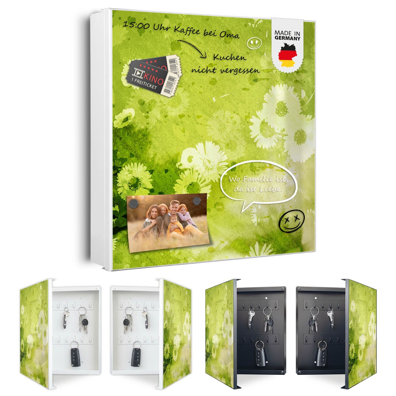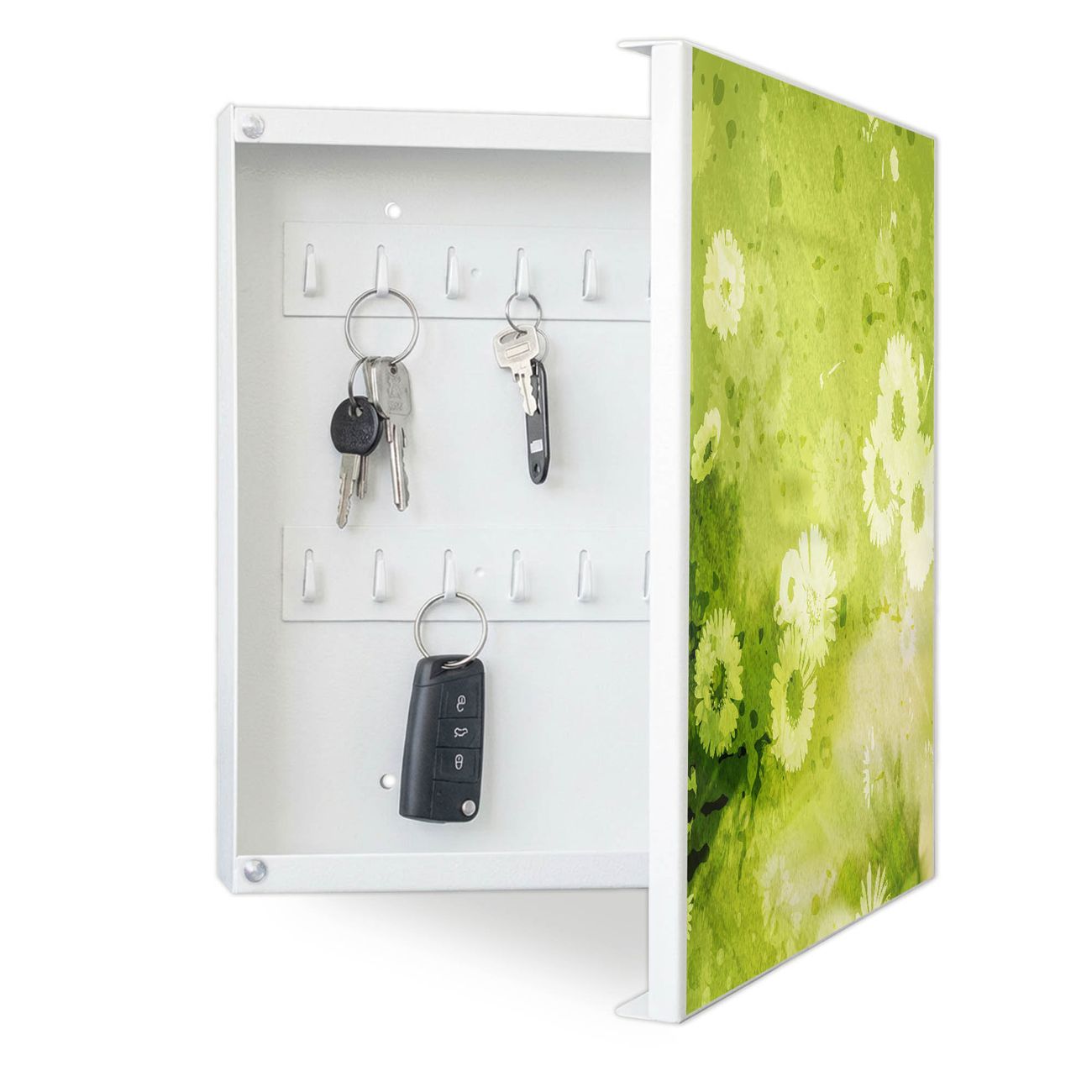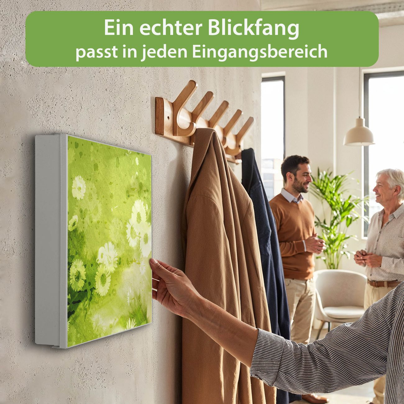 Bringe Ordnung und Eleganz in deinen Eingangsbereich mit dem banjado Schlüsselkasten Motiv Motiv Kamille Grün. Die moderne Schlüsselbox kombiniert funktionales Design mit hochwertiger Verarbeitung und wird so zu einem echten Hingucker in Flur, Büro oder Ferienwohnung. ✅ Stilvolle Schlüsselaufbewahrung mit Motiv Motiv Kamille Grün Der Design-Schlüsselkasten Motiv Motiv Kamille Grün bietet Platz für bis zu 32 Schlüssel, die auf 4 stabilen Reihen mit je 8 Haken übersichtlich verstaut werden. Mit seinen kompakten Maßen von 30 x 30 x 5 cm passt die Schlüsselbox perfekt auch in kleinere Räume. Der weiß lackierte Stahlkorpus mit rechts angeschlagenem Türscharnier harmoniert mit gedruckten Folie auf der Front und fügt sich nahtlos in jedes Wohnambiente ein. Ob als Schlüsselorganizer für Zuhause oder als praktische Lösung für Büros, Praxen und Gewerbe, der banjado Schlüsselkasten sorgt für Ordnung und Übersicht. Dank der magnetischen, mit Kreidestiften beschreibbaren Folie auf der Front kannst du Notizen anheften oder Termine direkt auf der Oberfläche festhalten. Die Schlüsselbox Motiv Motiv Kamille Grün zur Wandmontage wird inklusive Befestigungsmaterial geliefert und ist schnell angebracht. So hast du deine Schlüssel jederzeit griffbereit und zugleich stilvoll verstaut. Mit diesem banjado Schlüsselkasten Motiv Motiv Kamille Grün kombinierst du praktische Aufbewahrung mit stilvollem Wohndesign. Ob privat oder geschäftlich, die Schlüsselbox sorgt für mehr Ordnung, Übersicht und ein wohnliches Ambiente.Vorteile im Überblick
