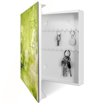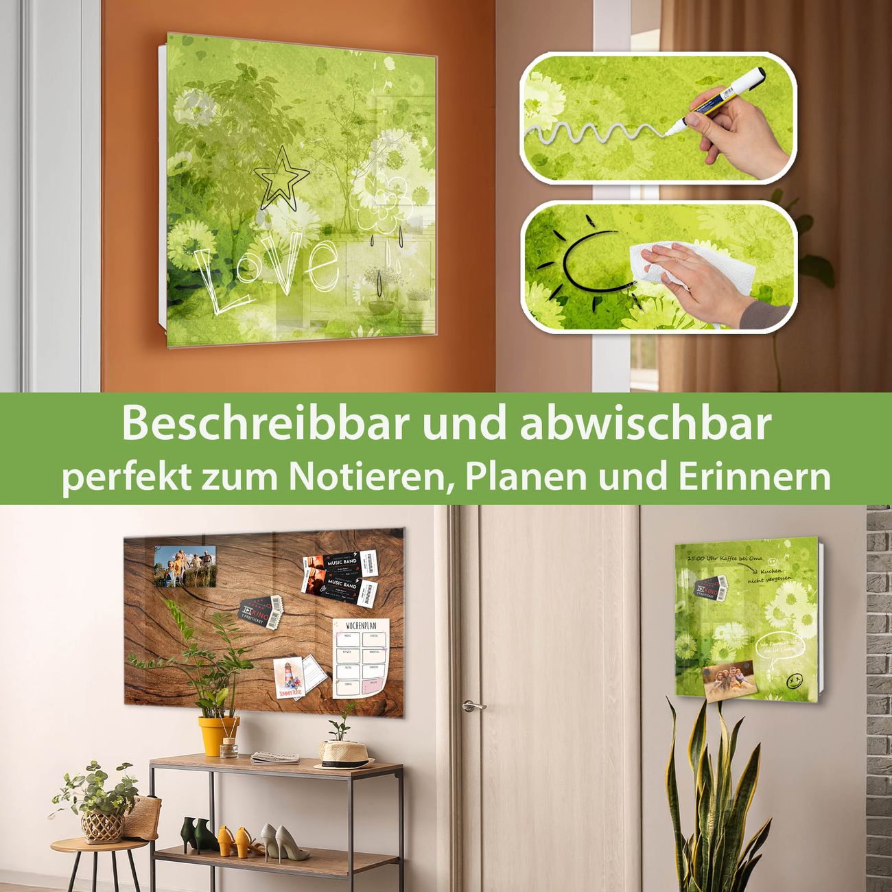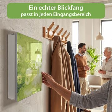 Bringe Ordnung und Eleganz in deinen Eingangsbereich mit dem banjado Schlüsselkasten Motiv Motiv Kamille Grün. Die moderne Schlüsselbox kombiniert funktionales Design mit hochwertiger Verarbeitung und wird so zu einem echten Hingucker in Flur, Büro oder Ferienwohnung. ✅ Stilvolle Schlüsselaufbewahrung mit Glasfront im Motiv Motiv Kamille Grün Der Design-Schlüsselkasten Motiv Motiv Kamille Grün bietet Platz für bis zu 50 Schlüssel, die auf 5 stabilen Reihen mit je 10 Haken übersichtlich verstaut werden. Mit seinen kompakten Maßen von 30 x 30 x 5 cm passt die Schlüsselbox perfekt auch in kleinere Räume. Der weiß lackierte Stahlkorpus mit rechts angeschlagenem Türscharnier harmoniert mit der Glasfront und fügt sich nahtlos in jedes Wohnambiente ein. Ob als Schlüsselorganizer für Zuhause oder als praktische Lösung für Büros, Praxen und Gewerbe, der banjado Schlüsselkasten sorgt für Ordnung und Übersicht. Dank der magnetischen, mit Kreidestiften beschreibbaren Glasfront kannst du Notizen anheften oder Termine direkt auf der Oberfläche festhalten. Die Schlüsselbox Motiv Motiv Kamille Grün zur Wandmontage wird inklusive Befestigungsmaterial geliefert und ist schnell angebracht. So hast du deine Schlüssel jederzeit griffbereit und zugleich stilvoll verstaut. Mit diesem banjado Schlüsselkasten Motiv Motiv Kamille Grün kombinierst du praktische Aufbewahrung mit stilvollem Wohndesign. Ob privat oder geschäftlich, die Schlüsselbox sorgt für mehr Ordnung, Übersicht und ein wohnliches Ambiente.Vorteile im Überblick