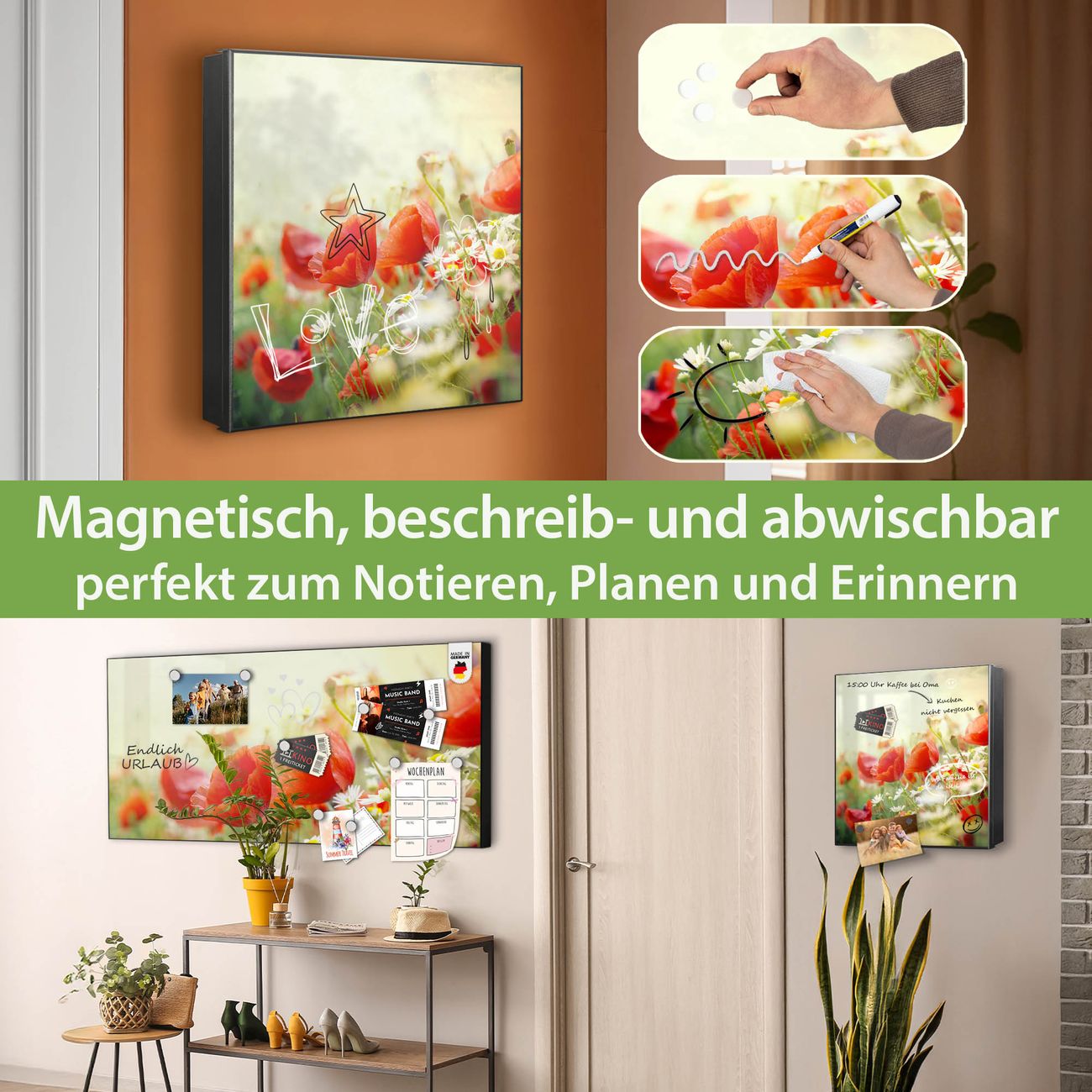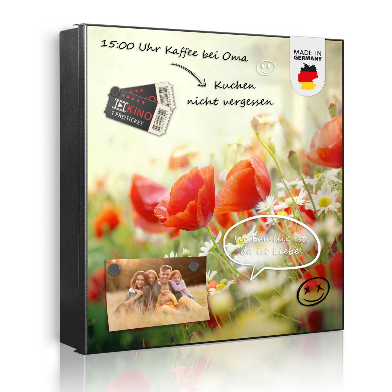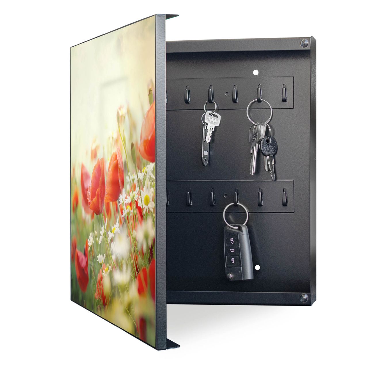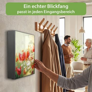 Bringe Ordnung und Eleganz in deinen Eingangsbereich mit dem banjado Schlüsselkasten Motiv Motiv Kamille Und Mohn. Die moderne Schlüsselbox kombiniert funktionales Design mit hochwertiger Verarbeitung und wird so zu einem echten Hingucker in Flur, Büro oder Ferienwohnung. ✅ Stilvolle Schlüsselaufbewahrung mit Motiv Motiv Kamille Und Mohn Der Design-Schlüsselkasten Motiv Motiv Kamille Und Mohn bietet Platz für bis zu 32 Schlüssel, die auf 4 stabilen Reihen mit je 8 Haken übersichtlich verstaut werden. Mit seinen kompakten Maßen von 30 x 30 x 5 cm passt die Schlüsselbox perfekt auch in kleinere Räume. Der schwarz lackierte Stahlkorpus mit links angeschlagenem Türscharnier harmoniert mit gedruckten Folie auf der Front und fügt sich nahtlos in jedes Wohnambiente ein. Ob als Schlüsselorganizer für Zuhause oder als praktische Lösung für Büros, Praxen und Gewerbe, der banjado Schlüsselkasten sorgt für Ordnung und Übersicht. Dank der magnetischen, mit Kreidestiften beschreibbaren Folie auf der Front kannst du Notizen anheften oder Termine direkt auf der Oberfläche festhalten. Die Schlüsselbox Motiv Motiv Kamille Und Mohn zur Wandmontage wird inklusive Befestigungsmaterial geliefert und ist schnell angebracht. So hast du deine Schlüssel jederzeit griffbereit und zugleich stilvoll verstaut. Mit diesem banjado Schlüsselkasten Motiv Motiv Kamille Und Mohn kombinierst du praktische Aufbewahrung mit stilvollem Wohndesign. Ob privat oder geschäftlich, die Schlüsselbox sorgt für mehr Ordnung, Übersicht und ein wohnliches Ambiente.Vorteile im Überblick
