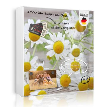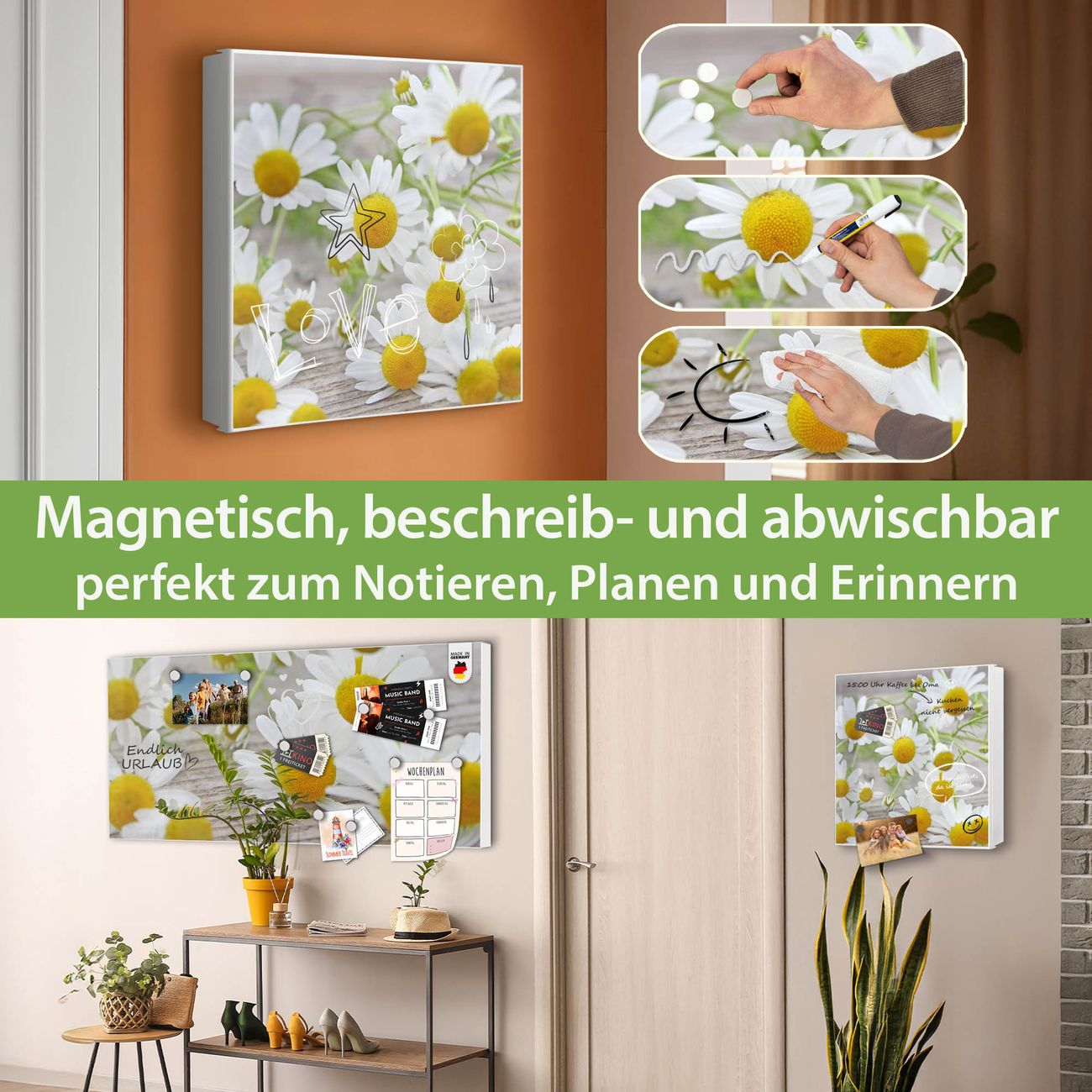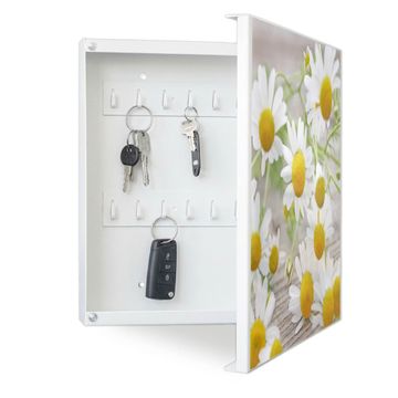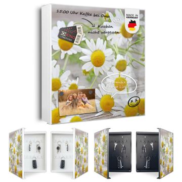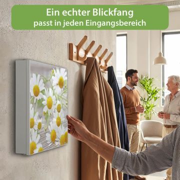 Bringe Ordnung und Eleganz in deinen Eingangsbereich mit dem banjado Schlüsselkasten Motiv Motiv Kamillenblüten. Die moderne Schlüsselbox kombiniert funktionales Design mit hochwertiger Verarbeitung und wird so zu einem echten Hingucker in Flur, Büro oder Ferienwohnung. ✅ Stilvolle Schlüsselaufbewahrung mit Motiv Motiv Kamillenblüten Der Design-Schlüsselkasten Motiv Motiv Kamillenblüten bietet Platz für bis zu 32 Schlüssel, die auf 4 stabilen Reihen mit je 8 Haken übersichtlich verstaut werden. Mit seinen kompakten Maßen von 30 x 30 x 5 cm passt die Schlüsselbox perfekt auch in kleinere Räume. Der weiß lackierte Stahlkorpus mit rechts angeschlagenem Türscharnier harmoniert mit gedruckten Folie auf der Front und fügt sich nahtlos in jedes Wohnambiente ein. Ob als Schlüsselorganizer für Zuhause oder als praktische Lösung für Büros, Praxen und Gewerbe, der banjado Schlüsselkasten sorgt für Ordnung und Übersicht. Dank der magnetischen, mit Kreidestiften beschreibbaren Folie auf der Front kannst du Notizen anheften oder Termine direkt auf der Oberfläche festhalten. Die Schlüsselbox Motiv Motiv Kamillenblüten zur Wandmontage wird inklusive Befestigungsmaterial geliefert und ist schnell angebracht. So hast du deine Schlüssel jederzeit griffbereit und zugleich stilvoll verstaut. Mit diesem banjado Schlüsselkasten Motiv Motiv Kamillenblüten kombinierst du praktische Aufbewahrung mit stilvollem Wohndesign. Ob privat oder geschäftlich, die Schlüsselbox sorgt für mehr Ordnung, Übersicht und ein wohnliches Ambiente.Vorteile im Überblick