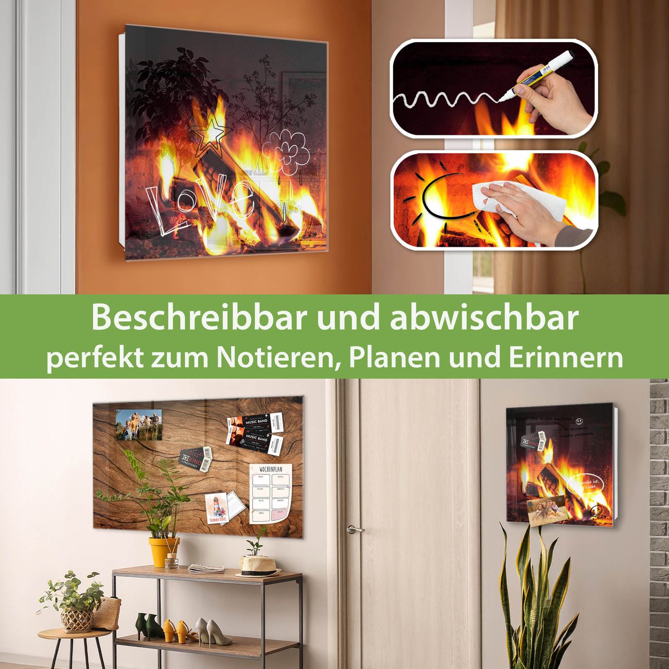 Bringe Ordnung und Eleganz in deinen Eingangsbereich mit dem banjado Schlüsselkasten Motiv Motiv Kaminfeuer. Die moderne Schlüsselbox kombiniert funktionales Design mit hochwertiger Verarbeitung und wird so zu einem echten Hingucker in Flur, Büro oder Ferienwohnung. ✅ Stilvolle Schlüsselaufbewahrung mit Glasfront im Motiv Motiv Kaminfeuer Der Design-Schlüsselkasten Motiv Motiv Kaminfeuer bietet Platz für bis zu 50 Schlüssel, die auf 5 stabilen Reihen mit je 10 Haken übersichtlich verstaut werden. Mit seinen kompakten Maßen von 30 x 30 x 5 cm passt die Schlüsselbox perfekt auch in kleinere Räume. Der weiß lackierte Stahlkorpus mit rechts angeschlagenem Türscharnier harmoniert mit der Glasfront und fügt sich nahtlos in jedes Wohnambiente ein. Ob als Schlüsselorganizer für Zuhause oder als praktische Lösung für Büros, Praxen und Gewerbe, der banjado Schlüsselkasten sorgt für Ordnung und Übersicht. Dank der magnetischen, mit Kreidestiften beschreibbaren Glasfront kannst du Notizen anheften oder Termine direkt auf der Oberfläche festhalten. Die Schlüsselbox Motiv Motiv Kaminfeuer zur Wandmontage wird inklusive Befestigungsmaterial geliefert und ist schnell angebracht. So hast du deine Schlüssel jederzeit griffbereit und zugleich stilvoll verstaut. Mit diesem banjado Schlüsselkasten Motiv Motiv Kaminfeuer kombinierst du praktische Aufbewahrung mit stilvollem Wohndesign. Ob privat oder geschäftlich, die Schlüsselbox sorgt für mehr Ordnung, Übersicht und ein wohnliches Ambiente.Vorteile im Überblick