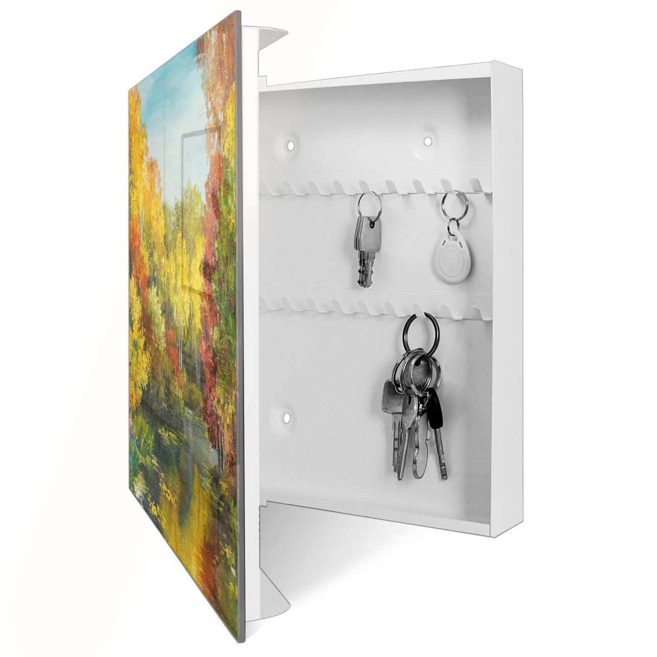Bringe Ordnung und Eleganz in deinen Eingangsbereich mit dem banjado Schlüsselkasten Motiv Motiv Kanal Im Herbst. Die moderne Schlüsselbox kombiniert funktionales Design mit hochwertiger Verarbeitung und wird so zu einem echten Hingucker in Flur, Büro oder Ferienwohnung. ✅ Stilvolle Schlüsselaufbewahrung mit Glasfront im Motiv Motiv Kanal Im Herbst Der Design-Schlüsselkasten Motiv Motiv Kanal Im Herbst bietet Platz für bis zu 50 Schlüssel, die auf 5 stabilen Reihen mit je 10 Haken übersichtlich verstaut werden. Mit seinen kompakten Maßen von 30 x 30 x 5 cm passt die Schlüsselbox perfekt auch in kleinere Räume. Der weiß lackierte Stahlkorpus mit rechts angeschlagenem Türscharnier harmoniert mit der Glasfront und fügt sich nahtlos in jedes Wohnambiente ein. Ob als Schlüsselorganizer für Zuhause oder als praktische Lösung für Büros, Praxen und Gewerbe, der banjado Schlüsselkasten sorgt für Ordnung und Übersicht. Dank der magnetischen, mit Kreidestiften beschreibbaren Glasfront kannst du Notizen anheften oder Termine direkt auf der Oberfläche festhalten. Die Schlüsselbox Motiv Motiv Kanal Im Herbst zur Wandmontage wird inklusive Befestigungsmaterial geliefert und ist schnell angebracht. So hast du deine Schlüssel jederzeit griffbereit und zugleich stilvoll verstaut. Mit diesem banjado Schlüsselkasten Motiv Motiv Kanal Im Herbst kombinierst du praktische Aufbewahrung mit stilvollem Wohndesign. Ob privat oder geschäftlich, die Schlüsselbox sorgt für mehr Ordnung, Übersicht und ein wohnliches Ambiente.Vorteile im Überblick
