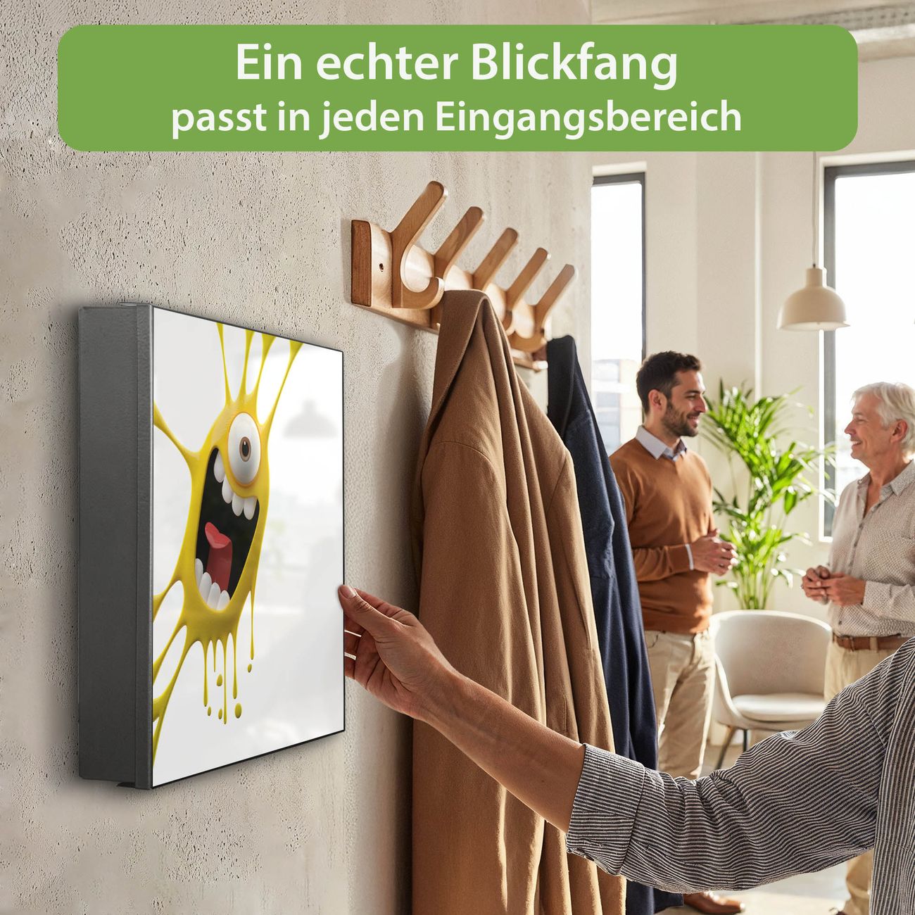 Bringe Ordnung und Eleganz in deinen Eingangsbereich mit dem banjado Schlüsselkasten Motiv Motiv Karl Splash. Die moderne Schlüsselbox kombiniert funktionales Design mit hochwertiger Verarbeitung und wird so zu einem echten Hingucker in Flur, Büro oder Ferienwohnung. ✅ Stilvolle Schlüsselaufbewahrung mit Motiv Motiv Karl Splash Der Design-Schlüsselkasten Motiv Motiv Karl Splash bietet Platz für bis zu 32 Schlüssel, die auf 4 stabilen Reihen mit je 8 Haken übersichtlich verstaut werden. Mit seinen kompakten Maßen von 30 x 30 x 5 cm passt die Schlüsselbox perfekt auch in kleinere Räume. Der schwarz lackierte Stahlkorpus mit rechts angeschlagenem Türscharnier harmoniert mit gedruckten Folie auf der Front und fügt sich nahtlos in jedes Wohnambiente ein. Ob als Schlüsselorganizer für Zuhause oder als praktische Lösung für Büros, Praxen und Gewerbe, der banjado Schlüsselkasten sorgt für Ordnung und Übersicht. Dank der magnetischen, mit Kreidestiften beschreibbaren Folie auf der Front kannst du Notizen anheften oder Termine direkt auf der Oberfläche festhalten. Die Schlüsselbox Motiv Motiv Karl Splash zur Wandmontage wird inklusive Befestigungsmaterial geliefert und ist schnell angebracht. So hast du deine Schlüssel jederzeit griffbereit und zugleich stilvoll verstaut. Mit diesem banjado Schlüsselkasten Motiv Motiv Karl Splash kombinierst du praktische Aufbewahrung mit stilvollem Wohndesign. Ob privat oder geschäftlich, die Schlüsselbox sorgt für mehr Ordnung, Übersicht und ein wohnliches Ambiente.Vorteile im Überblick