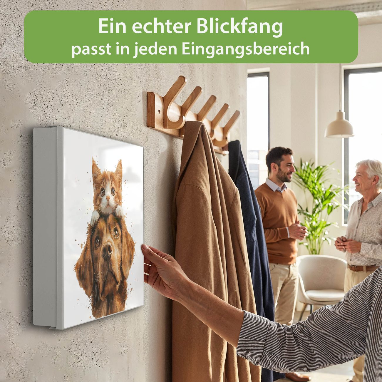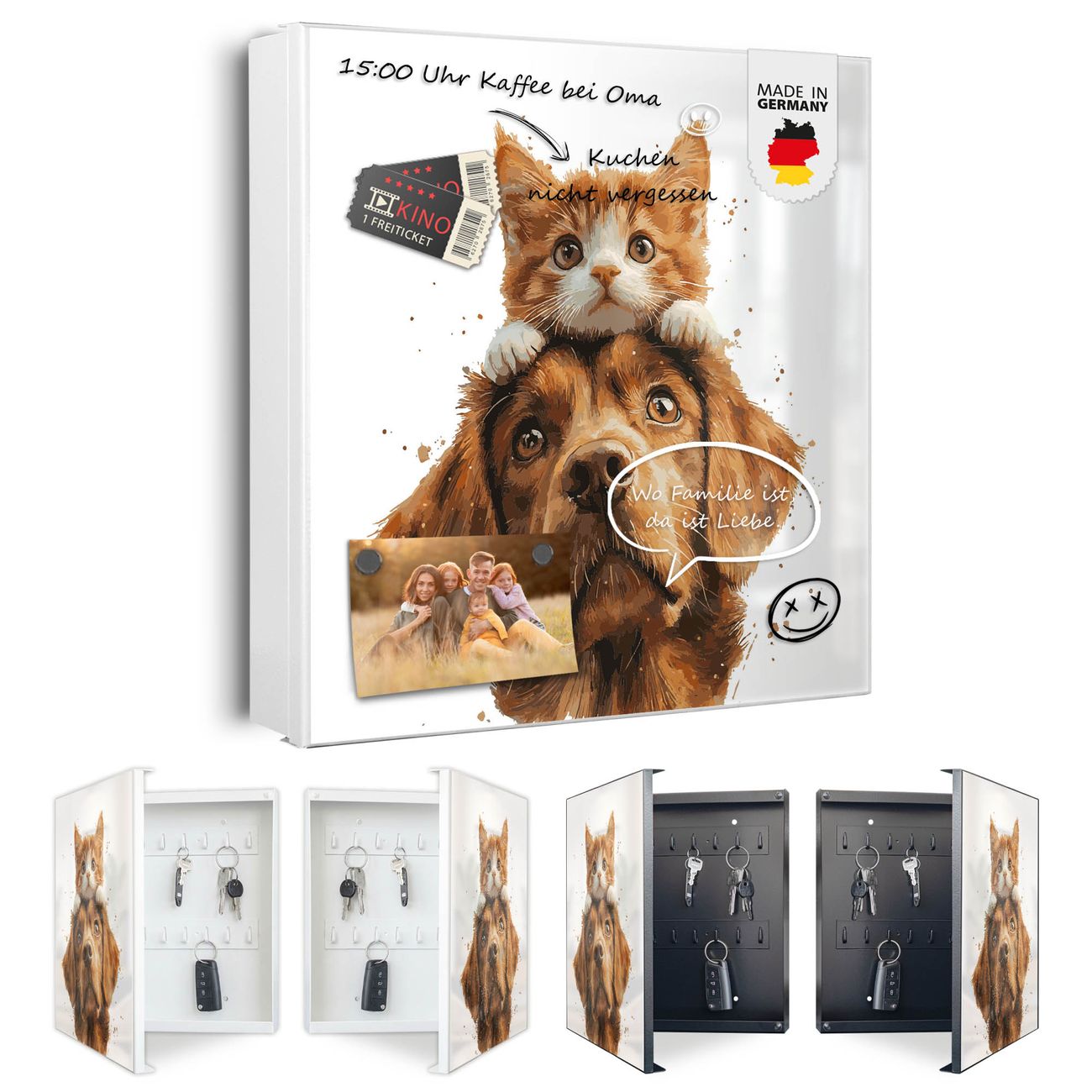 Bringe Ordnung und Eleganz in deinen Eingangsbereich mit dem banjado Schlüsselkasten Motiv Motiv Katzen- und Hundefreunde. Die moderne Schlüsselbox kombiniert funktionales Design mit hochwertiger Verarbeitung und wird so zu einem echten Hingucker in Flur, Büro oder Ferienwohnung. ✅ Stilvolle Schlüsselaufbewahrung mit Motiv Motiv Katzen- und Hundefreunde Der Design-Schlüsselkasten Motiv Motiv Katzen- und Hundefreunde bietet Platz für bis zu 32 Schlüssel, die auf 4 stabilen Reihen mit je 8 Haken übersichtlich verstaut werden. Mit seinen kompakten Maßen von 30 x 30 x 5 cm passt die Schlüsselbox perfekt auch in kleinere Räume. Der weiß lackierte Stahlkorpus mit links angeschlagenem Türscharnier harmoniert mit gedruckten Folie auf der Front und fügt sich nahtlos in jedes Wohnambiente ein. Ob als Schlüsselorganizer für Zuhause oder als praktische Lösung für Büros, Praxen und Gewerbe, der banjado Schlüsselkasten sorgt für Ordnung und Übersicht. Dank der magnetischen, mit Kreidestiften beschreibbaren Folie auf der Front kannst du Notizen anheften oder Termine direkt auf der Oberfläche festhalten. Die Schlüsselbox Motiv Motiv Katzen- und Hundefreunde zur Wandmontage wird inklusive Befestigungsmaterial geliefert und ist schnell angebracht. So hast du deine Schlüssel jederzeit griffbereit und zugleich stilvoll verstaut. Mit diesem banjado Schlüsselkasten Motiv Motiv Katzen- und Hundefreunde kombinierst du praktische Aufbewahrung mit stilvollem Wohndesign. Ob privat oder geschäftlich, die Schlüsselbox sorgt für mehr Ordnung, Übersicht und ein wohnliches Ambiente.Vorteile im Überblick