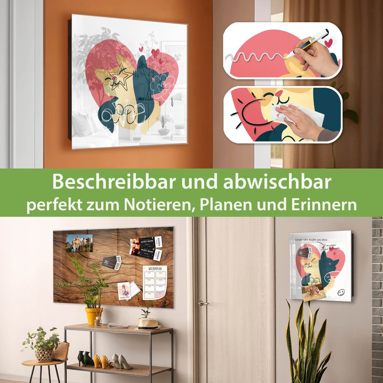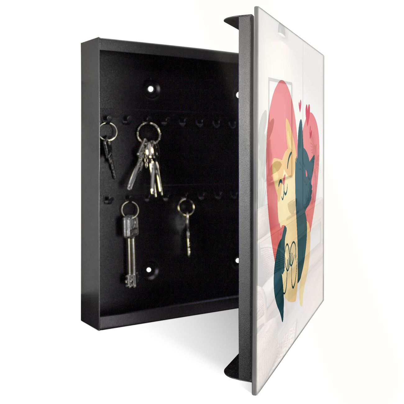 Bringe Ordnung und Eleganz in deinen Eingangsbereich mit dem banjado Schlüsselkasten Motiv Motiv Katzenliebe. Die moderne Schlüsselbox kombiniert funktionales Design mit hochwertiger Verarbeitung und wird so zu einem echten Hingucker in Flur, Büro oder Ferienwohnung. ✅ Stilvolle Schlüsselaufbewahrung mit Glasfront im Motiv Motiv Katzenliebe Der Design-Schlüsselkasten Motiv Motiv Katzenliebe bietet Platz für bis zu 50 Schlüssel, die auf 5 stabilen Reihen mit je 10 Haken übersichtlich verstaut werden. Mit seinen kompakten Maßen von 30 x 30 x 5 cm passt die Schlüsselbox perfekt auch in kleinere Räume. Der schwarz lackierte Stahlkorpus mit rechts angeschlagenem Türscharnier harmoniert mit der Glasfront und fügt sich nahtlos in jedes Wohnambiente ein. Ob als Schlüsselorganizer für Zuhause oder als praktische Lösung für Büros, Praxen und Gewerbe, der banjado Schlüsselkasten sorgt für Ordnung und Übersicht. Dank der magnetischen, mit Kreidestiften beschreibbaren Glasfront kannst du Notizen anheften oder Termine direkt auf der Oberfläche festhalten. Die Schlüsselbox Motiv Motiv Katzenliebe zur Wandmontage wird inklusive Befestigungsmaterial geliefert und ist schnell angebracht. So hast du deine Schlüssel jederzeit griffbereit und zugleich stilvoll verstaut. Mit diesem banjado Schlüsselkasten Motiv Motiv Katzenliebe kombinierst du praktische Aufbewahrung mit stilvollem Wohndesign. Ob privat oder geschäftlich, die Schlüsselbox sorgt für mehr Ordnung, Übersicht und ein wohnliches Ambiente.Vorteile im Überblick