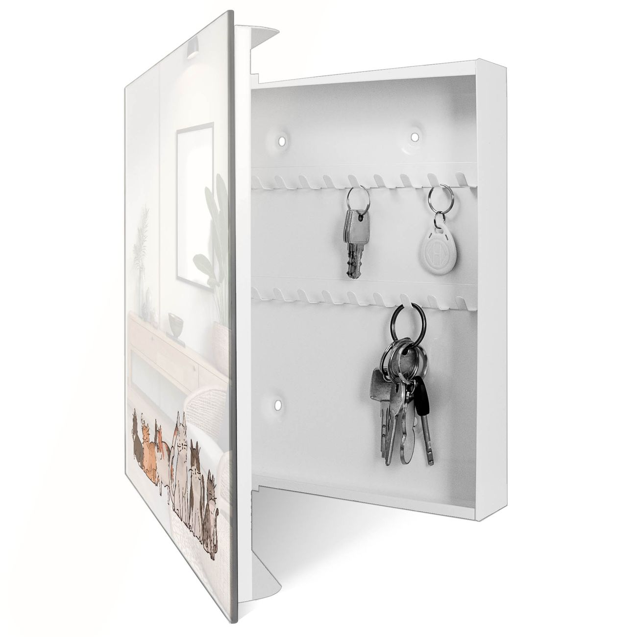 Bringe Ordnung und Eleganz in deinen Eingangsbereich mit dem banjado Schlüsselkasten Motiv Motiv Katzenparade 2. Die moderne Schlüsselbox kombiniert funktionales Design mit hochwertiger Verarbeitung und wird so zu einem echten Hingucker in Flur, Büro oder Ferienwohnung. ✅ Stilvolle Schlüsselaufbewahrung mit Glasfront im Motiv Motiv Katzenparade 2 Der Design-Schlüsselkasten Motiv Motiv Katzenparade 2 bietet Platz für bis zu 50 Schlüssel, die auf 5 stabilen Reihen mit je 10 Haken übersichtlich verstaut werden. Mit seinen kompakten Maßen von 30 x 30 x 5 cm passt die Schlüsselbox perfekt auch in kleinere Räume. Der weiß lackierte Stahlkorpus mit rechts angeschlagenem Türscharnier harmoniert mit der Glasfront und fügt sich nahtlos in jedes Wohnambiente ein. Ob als Schlüsselorganizer für Zuhause oder als praktische Lösung für Büros, Praxen und Gewerbe, der banjado Schlüsselkasten sorgt für Ordnung und Übersicht. Dank der magnetischen, mit Kreidestiften beschreibbaren Glasfront kannst du Notizen anheften oder Termine direkt auf der Oberfläche festhalten. Die Schlüsselbox Motiv Motiv Katzenparade 2 zur Wandmontage wird inklusive Befestigungsmaterial geliefert und ist schnell angebracht. So hast du deine Schlüssel jederzeit griffbereit und zugleich stilvoll verstaut. Mit diesem banjado Schlüsselkasten Motiv Motiv Katzenparade 2 kombinierst du praktische Aufbewahrung mit stilvollem Wohndesign. Ob privat oder geschäftlich, die Schlüsselbox sorgt für mehr Ordnung, Übersicht und ein wohnliches Ambiente.Vorteile im Überblick