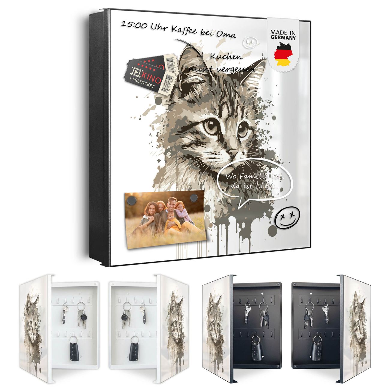 Bringe Ordnung und Eleganz in deinen Eingangsbereich mit dem banjado Schlüsselkasten Motiv Motiv Katzenportrait in Aquarell 3. Die moderne Schlüsselbox kombiniert funktionales Design mit hochwertiger Verarbeitung und wird so zu einem echten Hingucker in Flur, Büro oder Ferienwohnung. ✅ Stilvolle Schlüsselaufbewahrung mit Motiv Motiv Katzenportrait in Aquarell 3 Der Design-Schlüsselkasten Motiv Motiv Katzenportrait in Aquarell 3 bietet Platz für bis zu 32 Schlüssel, die auf 4 stabilen Reihen mit je 8 Haken übersichtlich verstaut werden. Mit seinen kompakten Maßen von 30 x 30 x 5 cm passt die Schlüsselbox perfekt auch in kleinere Räume. Der schwarz lackierte Stahlkorpus mit rechts angeschlagenem Türscharnier harmoniert mit gedruckten Folie auf der Front und fügt sich nahtlos in jedes Wohnambiente ein. Ob als Schlüsselorganizer für Zuhause oder als praktische Lösung für Büros, Praxen und Gewerbe, der banjado Schlüsselkasten sorgt für Ordnung und Übersicht. Dank der magnetischen, mit Kreidestiften beschreibbaren Folie auf der Front kannst du Notizen anheften oder Termine direkt auf der Oberfläche festhalten. Die Schlüsselbox Motiv Motiv Katzenportrait in Aquarell 3 zur Wandmontage wird inklusive Befestigungsmaterial geliefert und ist schnell angebracht. So hast du deine Schlüssel jederzeit griffbereit und zugleich stilvoll verstaut. Mit diesem banjado Schlüsselkasten Motiv Motiv Katzenportrait in Aquarell 3 kombinierst du praktische Aufbewahrung mit stilvollem Wohndesign. Ob privat oder geschäftlich, die Schlüsselbox sorgt für mehr Ordnung, Übersicht und ein wohnliches Ambiente.Vorteile im Überblick