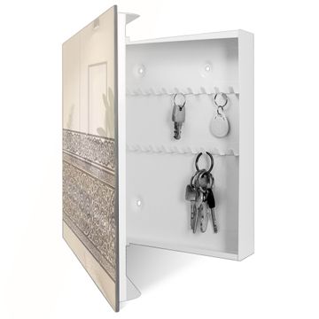 Bringe Ordnung und Eleganz in deinen Eingangsbereich mit dem banjado Schlüsselkasten Motiv Motiv Keltischer Knoten. Die moderne Schlüsselbox kombiniert funktionales Design mit hochwertiger Verarbeitung und wird so zu einem echten Hingucker in Flur, Büro oder Ferienwohnung. ✅ Stilvolle Schlüsselaufbewahrung mit Glasfront im Motiv Motiv Keltischer Knoten Der Design-Schlüsselkasten Motiv Motiv Keltischer Knoten bietet Platz für bis zu 50 Schlüssel, die auf 5 stabilen Reihen mit je 10 Haken übersichtlich verstaut werden. Mit seinen kompakten Maßen von 30 x 30 x 5 cm passt die Schlüsselbox perfekt auch in kleinere Räume. Der weiß lackierte Stahlkorpus mit rechts angeschlagenem Türscharnier harmoniert mit der Glasfront und fügt sich nahtlos in jedes Wohnambiente ein. Ob als Schlüsselorganizer für Zuhause oder als praktische Lösung für Büros, Praxen und Gewerbe, der banjado Schlüsselkasten sorgt für Ordnung und Übersicht. Dank der magnetischen, mit Kreidestiften beschreibbaren Glasfront kannst du Notizen anheften oder Termine direkt auf der Oberfläche festhalten. Die Schlüsselbox Motiv Motiv Keltischer Knoten zur Wandmontage wird inklusive Befestigungsmaterial geliefert und ist schnell angebracht. So hast du deine Schlüssel jederzeit griffbereit und zugleich stilvoll verstaut. Mit diesem banjado Schlüsselkasten Motiv Motiv Keltischer Knoten kombinierst du praktische Aufbewahrung mit stilvollem Wohndesign. Ob privat oder geschäftlich, die Schlüsselbox sorgt für mehr Ordnung, Übersicht und ein wohnliches Ambiente.Vorteile im Überblick