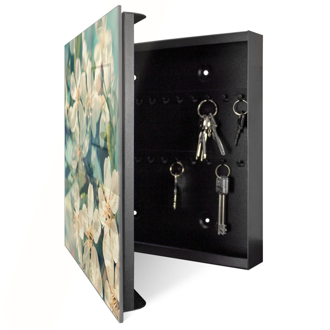 Bringe Ordnung und Eleganz in deinen Eingangsbereich mit dem banjado Schlüsselkasten Motiv Motiv Kirschblüten 2. Die moderne Schlüsselbox kombiniert funktionales Design mit hochwertiger Verarbeitung und wird so zu einem echten Hingucker in Flur, Büro oder Ferienwohnung. ✅ Stilvolle Schlüsselaufbewahrung mit Glasfront im Motiv Motiv Kirschblüten 2 Der Design-Schlüsselkasten Motiv Motiv Kirschblüten 2 bietet Platz für bis zu 50 Schlüssel, die auf 5 stabilen Reihen mit je 10 Haken übersichtlich verstaut werden. Mit seinen kompakten Maßen von 30 x 30 x 5 cm passt die Schlüsselbox perfekt auch in kleinere Räume. Der schwarz lackierte Stahlkorpus mit rechts angeschlagenem Türscharnier harmoniert mit der Glasfront und fügt sich nahtlos in jedes Wohnambiente ein. Ob als Schlüsselorganizer für Zuhause oder als praktische Lösung für Büros, Praxen und Gewerbe, der banjado Schlüsselkasten sorgt für Ordnung und Übersicht. Dank der magnetischen, mit Kreidestiften beschreibbaren Glasfront kannst du Notizen anheften oder Termine direkt auf der Oberfläche festhalten. Die Schlüsselbox Motiv Motiv Kirschblüten 2 zur Wandmontage wird inklusive Befestigungsmaterial geliefert und ist schnell angebracht. So hast du deine Schlüssel jederzeit griffbereit und zugleich stilvoll verstaut. Mit diesem banjado Schlüsselkasten Motiv Motiv Kirschblüten 2 kombinierst du praktische Aufbewahrung mit stilvollem Wohndesign. Ob privat oder geschäftlich, die Schlüsselbox sorgt für mehr Ordnung, Übersicht und ein wohnliches Ambiente.Vorteile im Überblick
