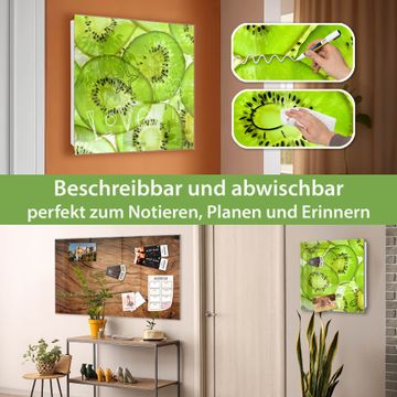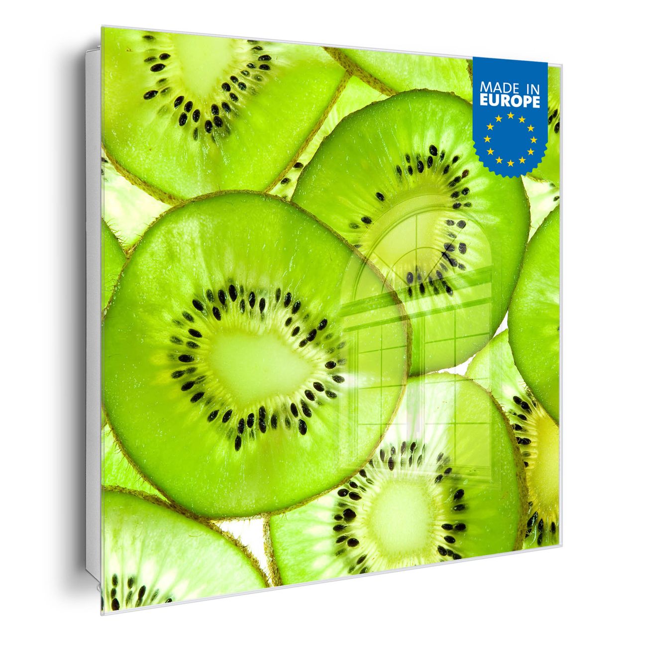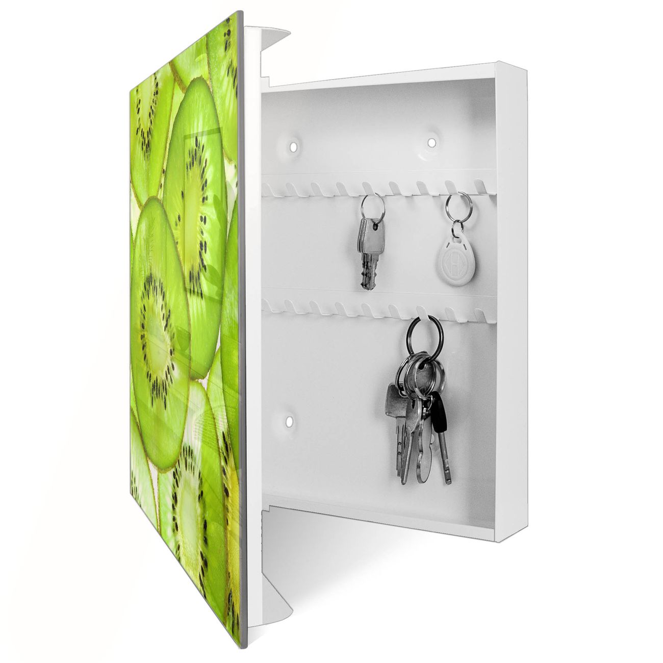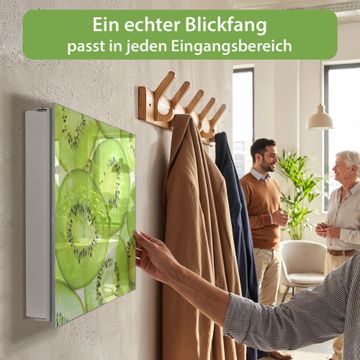 Bringe Ordnung und Eleganz in deinen Eingangsbereich mit dem banjado Schlüsselkasten Motiv Motiv Kiwi. Die moderne Schlüsselbox kombiniert funktionales Design mit hochwertiger Verarbeitung und wird so zu einem echten Hingucker in Flur, Büro oder Ferienwohnung. ✅ Stilvolle Schlüsselaufbewahrung mit Glasfront im Motiv Motiv Kiwi Der Design-Schlüsselkasten Motiv Motiv Kiwi bietet Platz für bis zu 50 Schlüssel, die auf 5 stabilen Reihen mit je 10 Haken übersichtlich verstaut werden. Mit seinen kompakten Maßen von 30 x 30 x 5 cm passt die Schlüsselbox perfekt auch in kleinere Räume. Der weiß lackierte Stahlkorpus mit rechts angeschlagenem Türscharnier harmoniert mit der Glasfront und fügt sich nahtlos in jedes Wohnambiente ein. Ob als Schlüsselorganizer für Zuhause oder als praktische Lösung für Büros, Praxen und Gewerbe, der banjado Schlüsselkasten sorgt für Ordnung und Übersicht. Dank der magnetischen, mit Kreidestiften beschreibbaren Glasfront kannst du Notizen anheften oder Termine direkt auf der Oberfläche festhalten. Die Schlüsselbox Motiv Motiv Kiwi zur Wandmontage wird inklusive Befestigungsmaterial geliefert und ist schnell angebracht. So hast du deine Schlüssel jederzeit griffbereit und zugleich stilvoll verstaut. Mit diesem banjado Schlüsselkasten Motiv Motiv Kiwi kombinierst du praktische Aufbewahrung mit stilvollem Wohndesign. Ob privat oder geschäftlich, die Schlüsselbox sorgt für mehr Ordnung, Übersicht und ein wohnliches Ambiente.Vorteile im Überblick
