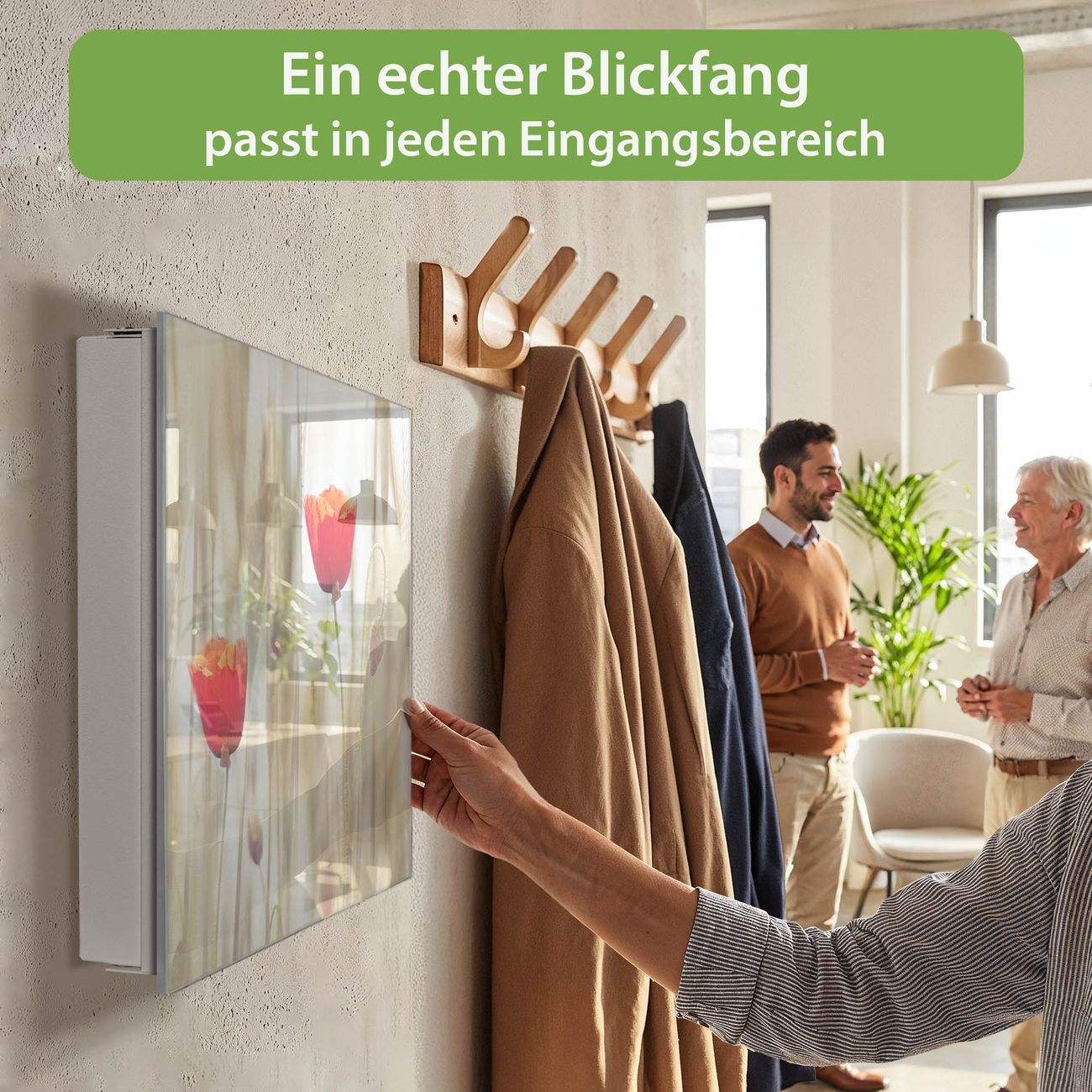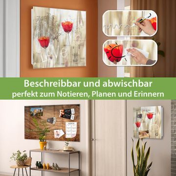 Bringe Ordnung und Eleganz in deinen Eingangsbereich mit dem banjado Schlüsselkasten Motiv Motiv Klatschmohn. Die moderne Schlüsselbox kombiniert funktionales Design mit hochwertiger Verarbeitung und wird so zu einem echten Hingucker in Flur, Büro oder Ferienwohnung. ✅ Stilvolle Schlüsselaufbewahrung mit Glasfront im Motiv Motiv Klatschmohn Der Design-Schlüsselkasten Motiv Motiv Klatschmohn bietet Platz für bis zu 50 Schlüssel, die auf 5 stabilen Reihen mit je 10 Haken übersichtlich verstaut werden. Mit seinen kompakten Maßen von 30 x 30 x 5 cm passt die Schlüsselbox perfekt auch in kleinere Räume. Der weiß lackierte Stahlkorpus mit rechts angeschlagenem Türscharnier harmoniert mit der Glasfront und fügt sich nahtlos in jedes Wohnambiente ein. Ob als Schlüsselorganizer für Zuhause oder als praktische Lösung für Büros, Praxen und Gewerbe, der banjado Schlüsselkasten sorgt für Ordnung und Übersicht. Dank der magnetischen, mit Kreidestiften beschreibbaren Glasfront kannst du Notizen anheften oder Termine direkt auf der Oberfläche festhalten. Die Schlüsselbox Motiv Motiv Klatschmohn zur Wandmontage wird inklusive Befestigungsmaterial geliefert und ist schnell angebracht. So hast du deine Schlüssel jederzeit griffbereit und zugleich stilvoll verstaut. Mit diesem banjado Schlüsselkasten Motiv Motiv Klatschmohn kombinierst du praktische Aufbewahrung mit stilvollem Wohndesign. Ob privat oder geschäftlich, die Schlüsselbox sorgt für mehr Ordnung, Übersicht und ein wohnliches Ambiente.Vorteile im Überblick