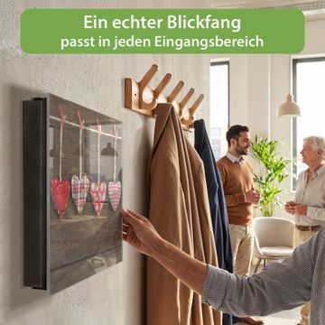 Bringe Ordnung und Eleganz in deinen Eingangsbereich mit dem banjado Schlüsselkasten Motiv Motiv Kleine Herzen. Die moderne Schlüsselbox kombiniert funktionales Design mit hochwertiger Verarbeitung und wird so zu einem echten Hingucker in Flur, Büro oder Ferienwohnung. ✅ Stilvolle Schlüsselaufbewahrung mit Glasfront im Motiv Motiv Kleine Herzen Der Design-Schlüsselkasten Motiv Motiv Kleine Herzen bietet Platz für bis zu 50 Schlüssel, die auf 5 stabilen Reihen mit je 10 Haken übersichtlich verstaut werden. Mit seinen kompakten Maßen von 30 x 30 x 5 cm passt die Schlüsselbox perfekt auch in kleinere Räume. Der schwarz lackierte Stahlkorpus mit rechts angeschlagenem Türscharnier harmoniert mit der Glasfront und fügt sich nahtlos in jedes Wohnambiente ein. Ob als Schlüsselorganizer für Zuhause oder als praktische Lösung für Büros, Praxen und Gewerbe, der banjado Schlüsselkasten sorgt für Ordnung und Übersicht. Dank der magnetischen, mit Kreidestiften beschreibbaren Glasfront kannst du Notizen anheften oder Termine direkt auf der Oberfläche festhalten. Die Schlüsselbox Motiv Motiv Kleine Herzen zur Wandmontage wird inklusive Befestigungsmaterial geliefert und ist schnell angebracht. So hast du deine Schlüssel jederzeit griffbereit und zugleich stilvoll verstaut. Mit diesem banjado Schlüsselkasten Motiv Motiv Kleine Herzen kombinierst du praktische Aufbewahrung mit stilvollem Wohndesign. Ob privat oder geschäftlich, die Schlüsselbox sorgt für mehr Ordnung, Übersicht und ein wohnliches Ambiente.Vorteile im Überblick