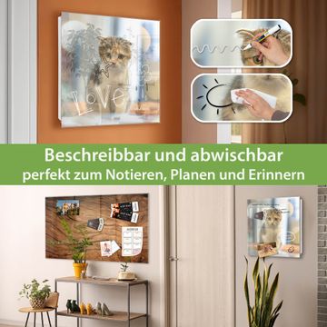Bringe Ordnung und Eleganz in deinen Eingangsbereich mit dem banjado Schlüsselkasten Motiv Motiv Kleine Katze. Die moderne Schlüsselbox kombiniert funktionales Design mit hochwertiger Verarbeitung und wird so zu einem echten Hingucker in Flur, Büro oder Ferienwohnung. ✅ Stilvolle Schlüsselaufbewahrung mit Glasfront im Motiv Motiv Kleine Katze Der Design-Schlüsselkasten Motiv Motiv Kleine Katze bietet Platz für bis zu 50 Schlüssel, die auf 5 stabilen Reihen mit je 10 Haken übersichtlich verstaut werden. Mit seinen kompakten Maßen von 30 x 30 x 5 cm passt die Schlüsselbox perfekt auch in kleinere Räume. Der weiß lackierte Stahlkorpus mit rechts angeschlagenem Türscharnier harmoniert mit der Glasfront und fügt sich nahtlos in jedes Wohnambiente ein. Ob als Schlüsselorganizer für Zuhause oder als praktische Lösung für Büros, Praxen und Gewerbe, der banjado Schlüsselkasten sorgt für Ordnung und Übersicht. Dank der magnetischen, mit Kreidestiften beschreibbaren Glasfront kannst du Notizen anheften oder Termine direkt auf der Oberfläche festhalten. Die Schlüsselbox Motiv Motiv Kleine Katze zur Wandmontage wird inklusive Befestigungsmaterial geliefert und ist schnell angebracht. So hast du deine Schlüssel jederzeit griffbereit und zugleich stilvoll verstaut. Mit diesem banjado Schlüsselkasten Motiv Motiv Kleine Katze kombinierst du praktische Aufbewahrung mit stilvollem Wohndesign. Ob privat oder geschäftlich, die Schlüsselbox sorgt für mehr Ordnung, Übersicht und ein wohnliches Ambiente.Vorteile im Überblick