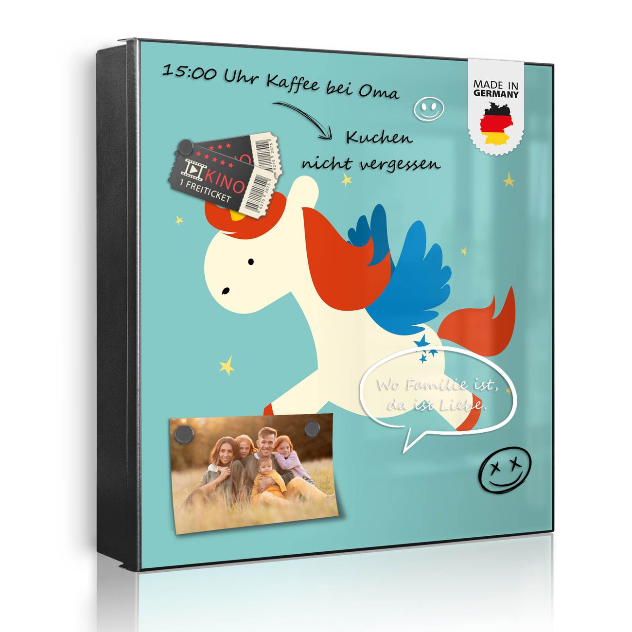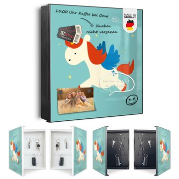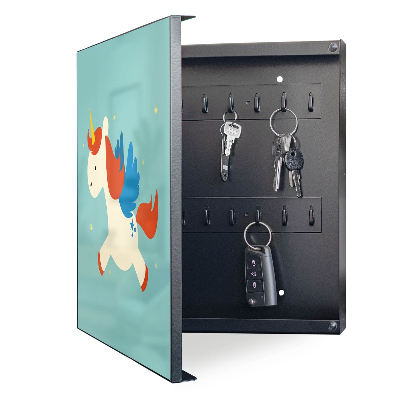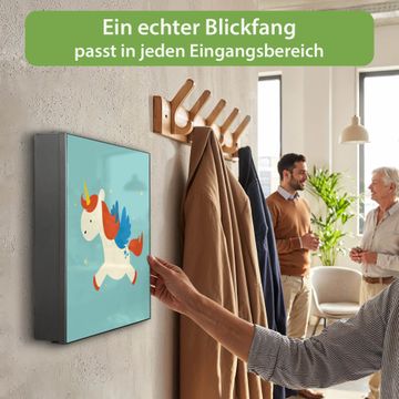 Bringe Ordnung und Eleganz in deinen Eingangsbereich mit dem banjado Schlüsselkasten Motiv Motiv Kleines Einhorn. Die moderne Schlüsselbox kombiniert funktionales Design mit hochwertiger Verarbeitung und wird so zu einem echten Hingucker in Flur, Büro oder Ferienwohnung. ✅ Stilvolle Schlüsselaufbewahrung mit Motiv Motiv Kleines Einhorn Der Design-Schlüsselkasten Motiv Motiv Kleines Einhorn bietet Platz für bis zu 32 Schlüssel, die auf 4 stabilen Reihen mit je 8 Haken übersichtlich verstaut werden. Mit seinen kompakten Maßen von 30 x 30 x 5 cm passt die Schlüsselbox perfekt auch in kleinere Räume. Der schwarz lackierte Stahlkorpus mit links angeschlagenem Türscharnier harmoniert mit gedruckten Folie auf der Front und fügt sich nahtlos in jedes Wohnambiente ein. Ob als Schlüsselorganizer für Zuhause oder als praktische Lösung für Büros, Praxen und Gewerbe, der banjado Schlüsselkasten sorgt für Ordnung und Übersicht. Dank der magnetischen, mit Kreidestiften beschreibbaren Folie auf der Front kannst du Notizen anheften oder Termine direkt auf der Oberfläche festhalten. Die Schlüsselbox Motiv Motiv Kleines Einhorn zur Wandmontage wird inklusive Befestigungsmaterial geliefert und ist schnell angebracht. So hast du deine Schlüssel jederzeit griffbereit und zugleich stilvoll verstaut. Mit diesem banjado Schlüsselkasten Motiv Motiv Kleines Einhorn kombinierst du praktische Aufbewahrung mit stilvollem Wohndesign. Ob privat oder geschäftlich, die Schlüsselbox sorgt für mehr Ordnung, Übersicht und ein wohnliches Ambiente.Vorteile im Überblick
