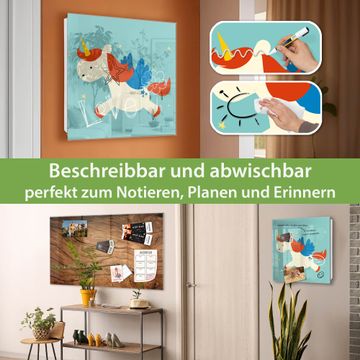 Bringe Ordnung und Eleganz in deinen Eingangsbereich mit dem banjado Schlüsselkasten Motiv Motiv Kleines Einhorn. Die moderne Schlüsselbox kombiniert funktionales Design mit hochwertiger Verarbeitung und wird so zu einem echten Hingucker in Flur, Büro oder Ferienwohnung. ✅ Stilvolle Schlüsselaufbewahrung mit Glasfront im Motiv Motiv Kleines Einhorn Der Design-Schlüsselkasten Motiv Motiv Kleines Einhorn bietet Platz für bis zu 50 Schlüssel, die auf 5 stabilen Reihen mit je 10 Haken übersichtlich verstaut werden. Mit seinen kompakten Maßen von 30 x 30 x 5 cm passt die Schlüsselbox perfekt auch in kleinere Räume. Der weiß lackierte Stahlkorpus mit rechts angeschlagenem Türscharnier harmoniert mit der Glasfront und fügt sich nahtlos in jedes Wohnambiente ein. Ob als Schlüsselorganizer für Zuhause oder als praktische Lösung für Büros, Praxen und Gewerbe, der banjado Schlüsselkasten sorgt für Ordnung und Übersicht. Dank der magnetischen, mit Kreidestiften beschreibbaren Glasfront kannst du Notizen anheften oder Termine direkt auf der Oberfläche festhalten. Die Schlüsselbox Motiv Motiv Kleines Einhorn zur Wandmontage wird inklusive Befestigungsmaterial geliefert und ist schnell angebracht. So hast du deine Schlüssel jederzeit griffbereit und zugleich stilvoll verstaut. Mit diesem banjado Schlüsselkasten Motiv Motiv Kleines Einhorn kombinierst du praktische Aufbewahrung mit stilvollem Wohndesign. Ob privat oder geschäftlich, die Schlüsselbox sorgt für mehr Ordnung, Übersicht und ein wohnliches Ambiente.Vorteile im Überblick