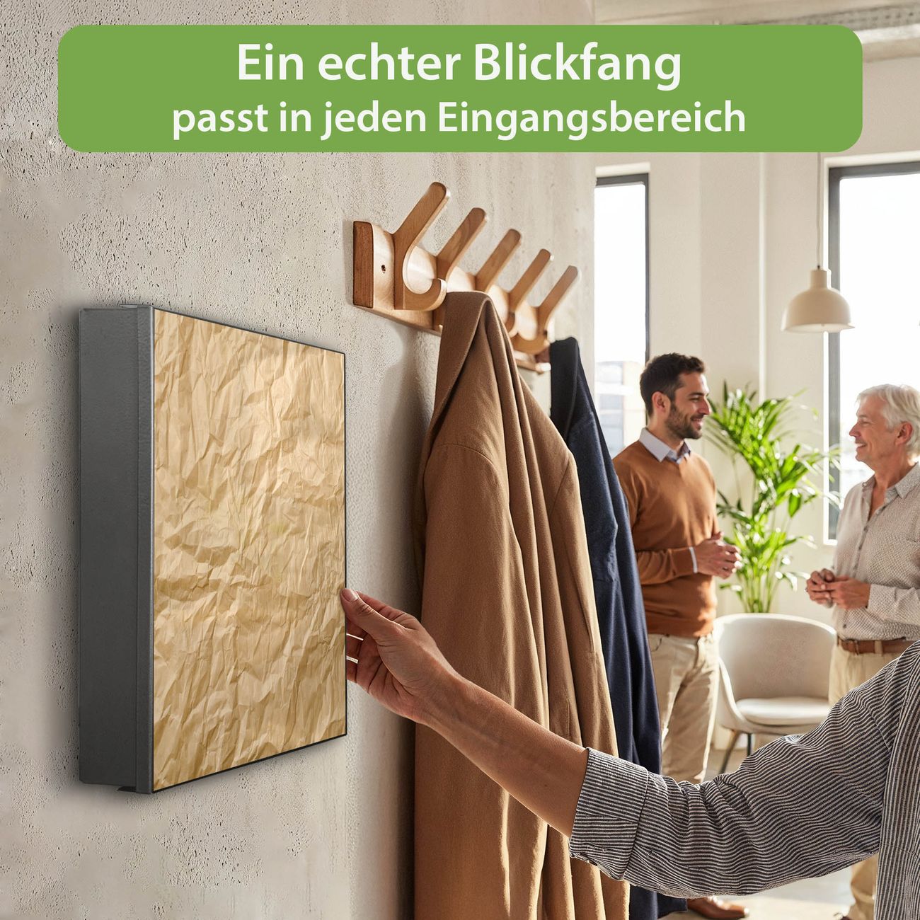 Bringe Ordnung und Eleganz in deinen Eingangsbereich mit dem banjado Schlüsselkasten Motiv Motiv Knüllpapier. Die moderne Schlüsselbox kombiniert funktionales Design mit hochwertiger Verarbeitung und wird so zu einem echten Hingucker in Flur, Büro oder Ferienwohnung. ✅ Stilvolle Schlüsselaufbewahrung mit Motiv Motiv Knüllpapier Der Design-Schlüsselkasten Motiv Motiv Knüllpapier bietet Platz für bis zu 32 Schlüssel, die auf 4 stabilen Reihen mit je 8 Haken übersichtlich verstaut werden. Mit seinen kompakten Maßen von 30 x 30 x 5 cm passt die Schlüsselbox perfekt auch in kleinere Räume. Der schwarz lackierte Stahlkorpus mit rechts angeschlagenem Türscharnier harmoniert mit gedruckten Folie auf der Front und fügt sich nahtlos in jedes Wohnambiente ein. Ob als Schlüsselorganizer für Zuhause oder als praktische Lösung für Büros, Praxen und Gewerbe, der banjado Schlüsselkasten sorgt für Ordnung und Übersicht. Dank der magnetischen, mit Kreidestiften beschreibbaren Folie auf der Front kannst du Notizen anheften oder Termine direkt auf der Oberfläche festhalten. Die Schlüsselbox Motiv Motiv Knüllpapier zur Wandmontage wird inklusive Befestigungsmaterial geliefert und ist schnell angebracht. So hast du deine Schlüssel jederzeit griffbereit und zugleich stilvoll verstaut. Mit diesem banjado Schlüsselkasten Motiv Motiv Knüllpapier kombinierst du praktische Aufbewahrung mit stilvollem Wohndesign. Ob privat oder geschäftlich, die Schlüsselbox sorgt für mehr Ordnung, Übersicht und ein wohnliches Ambiente.Vorteile im Überblick