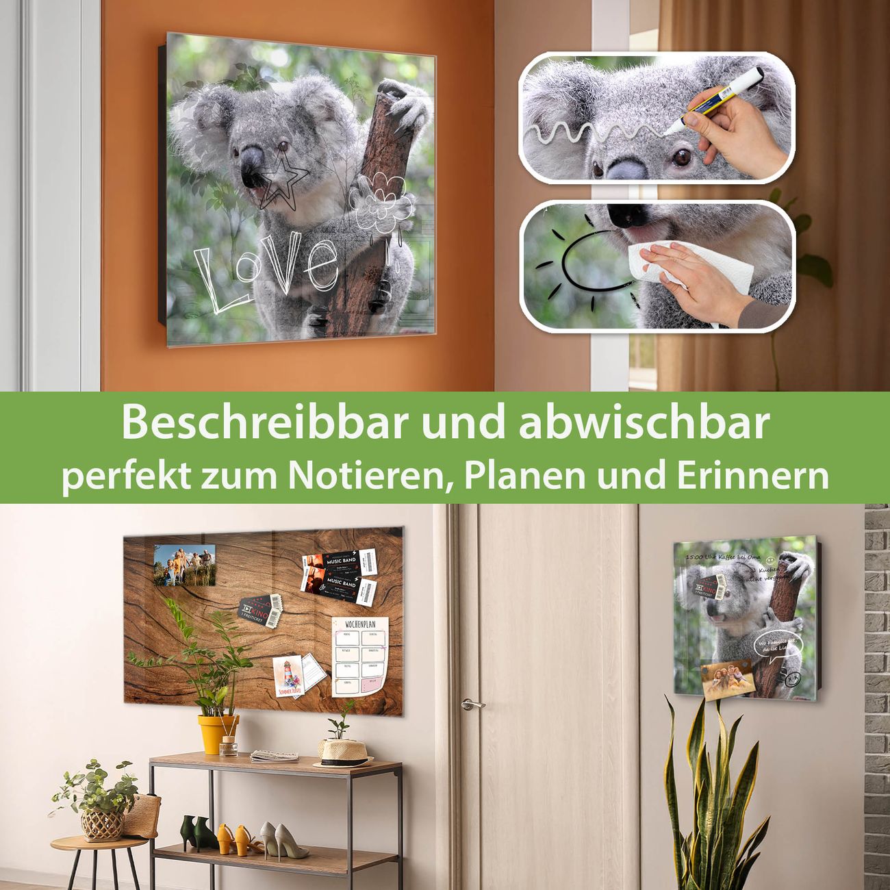 Bringe Ordnung und Eleganz in deinen Eingangsbereich mit dem banjado Schlüsselkasten Motiv Motiv Koala. Die moderne Schlüsselbox kombiniert funktionales Design mit hochwertiger Verarbeitung und wird so zu einem echten Hingucker in Flur, Büro oder Ferienwohnung. ✅ Stilvolle Schlüsselaufbewahrung mit Glasfront im Motiv Motiv Koala Der Design-Schlüsselkasten Motiv Motiv Koala bietet Platz für bis zu 50 Schlüssel, die auf 5 stabilen Reihen mit je 10 Haken übersichtlich verstaut werden. Mit seinen kompakten Maßen von 30 x 30 x 5 cm passt die Schlüsselbox perfekt auch in kleinere Räume. Der schwarz lackierte Stahlkorpus mit rechts angeschlagenem Türscharnier harmoniert mit der Glasfront und fügt sich nahtlos in jedes Wohnambiente ein. Ob als Schlüsselorganizer für Zuhause oder als praktische Lösung für Büros, Praxen und Gewerbe, der banjado Schlüsselkasten sorgt für Ordnung und Übersicht. Dank der magnetischen, mit Kreidestiften beschreibbaren Glasfront kannst du Notizen anheften oder Termine direkt auf der Oberfläche festhalten. Die Schlüsselbox Motiv Motiv Koala zur Wandmontage wird inklusive Befestigungsmaterial geliefert und ist schnell angebracht. So hast du deine Schlüssel jederzeit griffbereit und zugleich stilvoll verstaut. Mit diesem banjado Schlüsselkasten Motiv Motiv Koala kombinierst du praktische Aufbewahrung mit stilvollem Wohndesign. Ob privat oder geschäftlich, die Schlüsselbox sorgt für mehr Ordnung, Übersicht und ein wohnliches Ambiente.Vorteile im Überblick