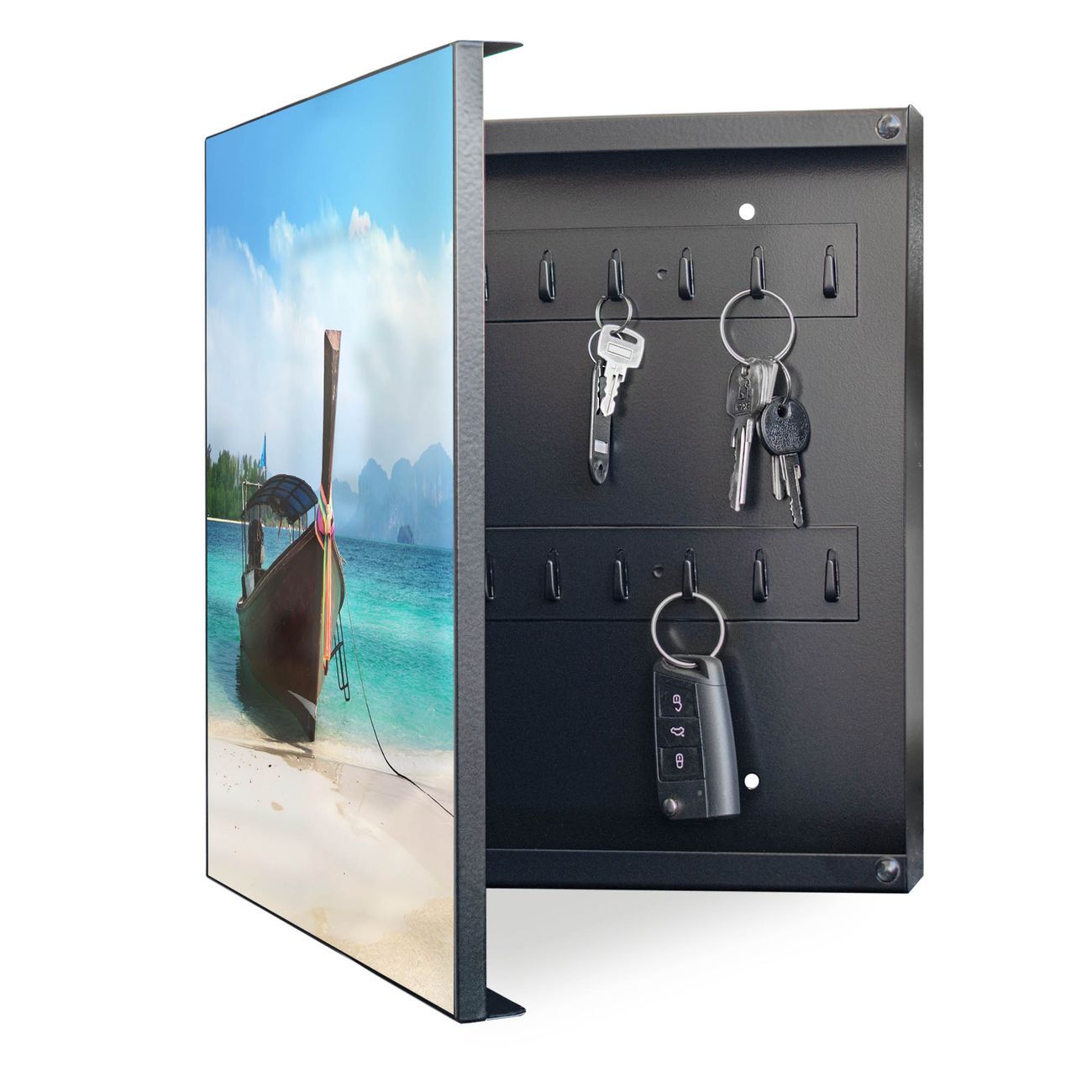 Bringe Ordnung und Eleganz in deinen Eingangsbereich mit dem banjado Schlüsselkasten Motiv Motiv Koh Poda. Die moderne Schlüsselbox kombiniert funktionales Design mit hochwertiger Verarbeitung und wird so zu einem echten Hingucker in Flur, Büro oder Ferienwohnung. ✅ Stilvolle Schlüsselaufbewahrung mit Motiv Motiv Koh Poda Der Design-Schlüsselkasten Motiv Motiv Koh Poda bietet Platz für bis zu 32 Schlüssel, die auf 4 stabilen Reihen mit je 8 Haken übersichtlich verstaut werden. Mit seinen kompakten Maßen von 30 x 30 x 5 cm passt die Schlüsselbox perfekt auch in kleinere Räume. Der schwarz lackierte Stahlkorpus mit links angeschlagenem Türscharnier harmoniert mit gedruckten Folie auf der Front und fügt sich nahtlos in jedes Wohnambiente ein. Ob als Schlüsselorganizer für Zuhause oder als praktische Lösung für Büros, Praxen und Gewerbe, der banjado Schlüsselkasten sorgt für Ordnung und Übersicht. Dank der magnetischen, mit Kreidestiften beschreibbaren Folie auf der Front kannst du Notizen anheften oder Termine direkt auf der Oberfläche festhalten. Die Schlüsselbox Motiv Motiv Koh Poda zur Wandmontage wird inklusive Befestigungsmaterial geliefert und ist schnell angebracht. So hast du deine Schlüssel jederzeit griffbereit und zugleich stilvoll verstaut. Mit diesem banjado Schlüsselkasten Motiv Motiv Koh Poda kombinierst du praktische Aufbewahrung mit stilvollem Wohndesign. Ob privat oder geschäftlich, die Schlüsselbox sorgt für mehr Ordnung, Übersicht und ein wohnliches Ambiente.Vorteile im Überblick