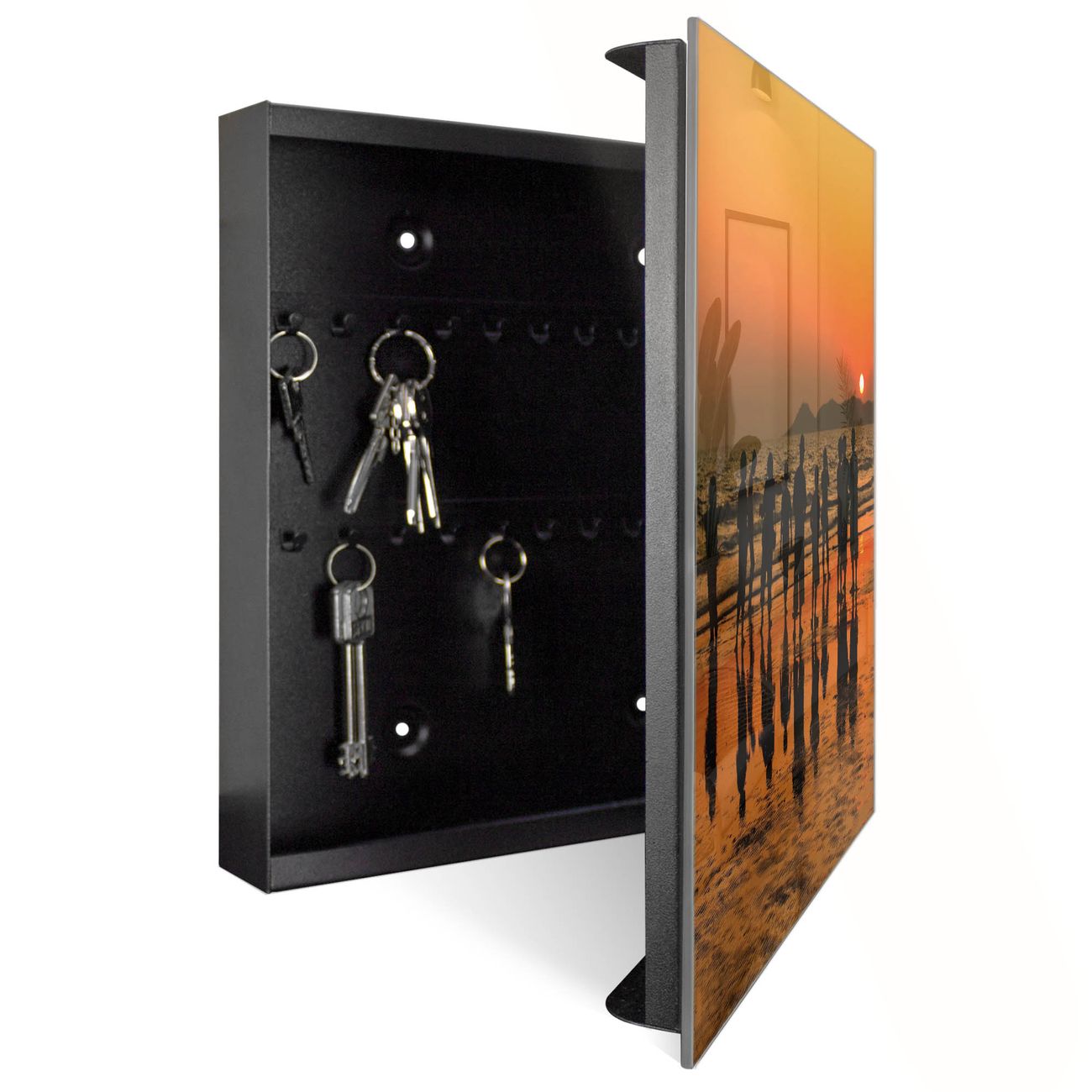 Bringe Ordnung und Eleganz in deinen Eingangsbereich mit dem banjado Schlüsselkasten Motiv Motiv Koh Samet Beach. Die moderne Schlüsselbox kombiniert funktionales Design mit hochwertiger Verarbeitung und wird so zu einem echten Hingucker in Flur, Büro oder Ferienwohnung. ✅ Stilvolle Schlüsselaufbewahrung mit Glasfront im Motiv Motiv Koh Samet Beach Der Design-Schlüsselkasten Motiv Motiv Koh Samet Beach bietet Platz für bis zu 50 Schlüssel, die auf 5 stabilen Reihen mit je 10 Haken übersichtlich verstaut werden. Mit seinen kompakten Maßen von 30 x 30 x 5 cm passt die Schlüsselbox perfekt auch in kleinere Räume. Der schwarz lackierte Stahlkorpus mit rechts angeschlagenem Türscharnier harmoniert mit der Glasfront und fügt sich nahtlos in jedes Wohnambiente ein. Ob als Schlüsselorganizer für Zuhause oder als praktische Lösung für Büros, Praxen und Gewerbe, der banjado Schlüsselkasten sorgt für Ordnung und Übersicht. Dank der magnetischen, mit Kreidestiften beschreibbaren Glasfront kannst du Notizen anheften oder Termine direkt auf der Oberfläche festhalten. Die Schlüsselbox Motiv Motiv Koh Samet Beach zur Wandmontage wird inklusive Befestigungsmaterial geliefert und ist schnell angebracht. So hast du deine Schlüssel jederzeit griffbereit und zugleich stilvoll verstaut. Mit diesem banjado Schlüsselkasten Motiv Motiv Koh Samet Beach kombinierst du praktische Aufbewahrung mit stilvollem Wohndesign. Ob privat oder geschäftlich, die Schlüsselbox sorgt für mehr Ordnung, Übersicht und ein wohnliches Ambiente.Vorteile im Überblick