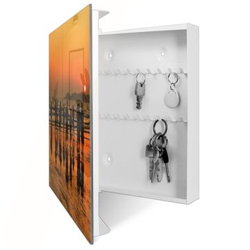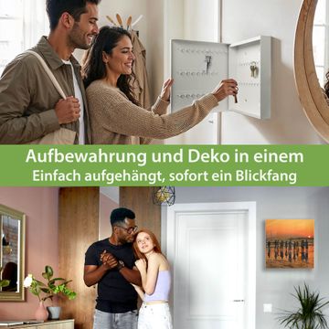 Bringe Ordnung und Eleganz in deinen Eingangsbereich mit dem banjado Schlüsselkasten Motiv Motiv Koh Samet Beach. Die moderne Schlüsselbox kombiniert funktionales Design mit hochwertiger Verarbeitung und wird so zu einem echten Hingucker in Flur, Büro oder Ferienwohnung. ✅ Stilvolle Schlüsselaufbewahrung mit Glasfront im Motiv Motiv Koh Samet Beach Der Design-Schlüsselkasten Motiv Motiv Koh Samet Beach bietet Platz für bis zu 50 Schlüssel, die auf 5 stabilen Reihen mit je 10 Haken übersichtlich verstaut werden. Mit seinen kompakten Maßen von 30 x 30 x 5 cm passt die Schlüsselbox perfekt auch in kleinere Räume. Der weiß lackierte Stahlkorpus mit rechts angeschlagenem Türscharnier harmoniert mit der Glasfront und fügt sich nahtlos in jedes Wohnambiente ein. Ob als Schlüsselorganizer für Zuhause oder als praktische Lösung für Büros, Praxen und Gewerbe, der banjado Schlüsselkasten sorgt für Ordnung und Übersicht. Dank der magnetischen, mit Kreidestiften beschreibbaren Glasfront kannst du Notizen anheften oder Termine direkt auf der Oberfläche festhalten. Die Schlüsselbox Motiv Motiv Koh Samet Beach zur Wandmontage wird inklusive Befestigungsmaterial geliefert und ist schnell angebracht. So hast du deine Schlüssel jederzeit griffbereit und zugleich stilvoll verstaut. Mit diesem banjado Schlüsselkasten Motiv Motiv Koh Samet Beach kombinierst du praktische Aufbewahrung mit stilvollem Wohndesign. Ob privat oder geschäftlich, die Schlüsselbox sorgt für mehr Ordnung, Übersicht und ein wohnliches Ambiente.Vorteile im Überblick