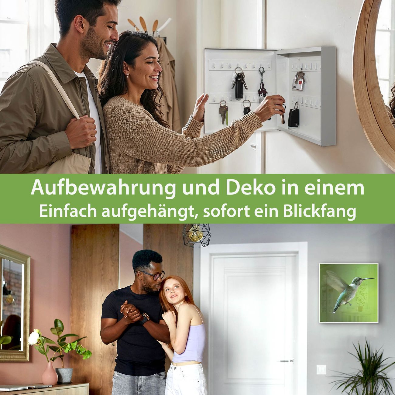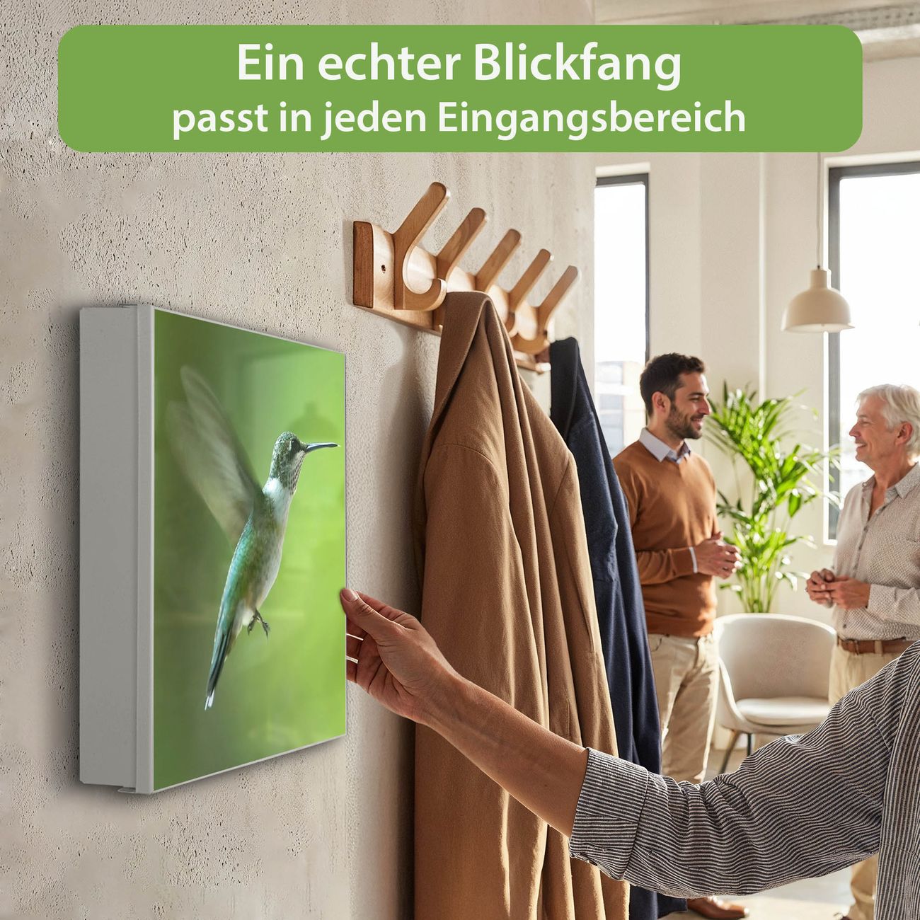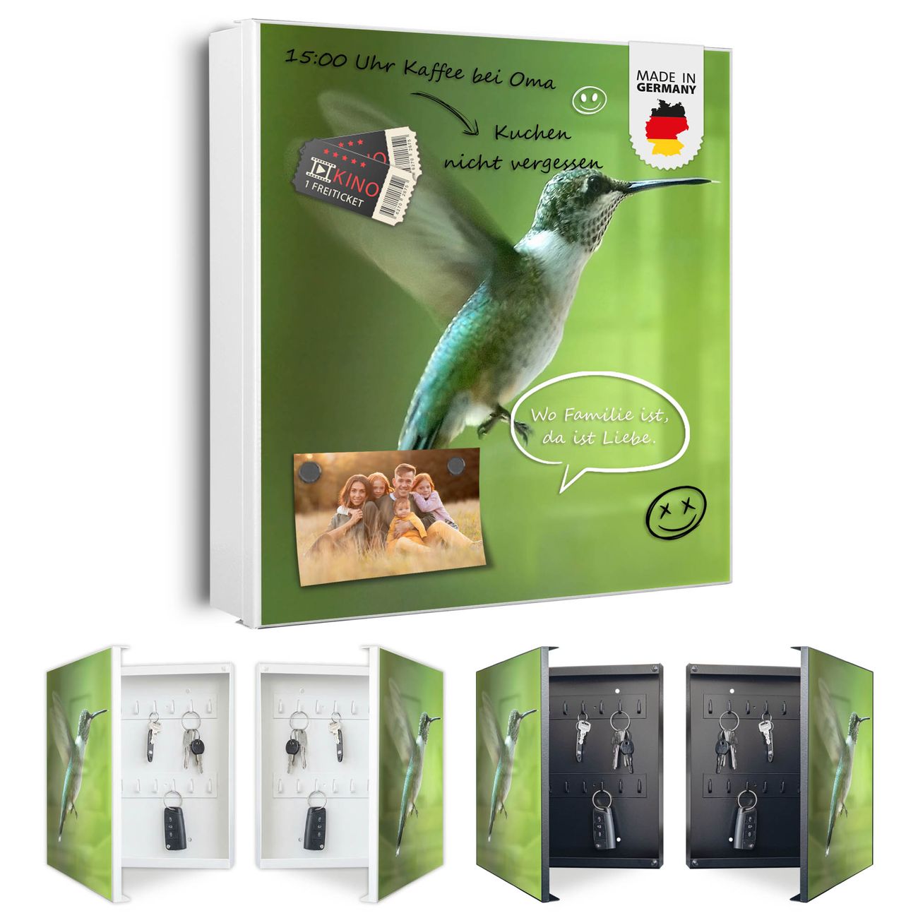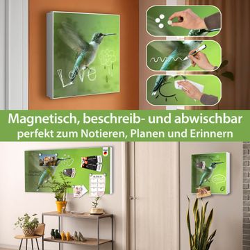 Bringe Ordnung und Eleganz in deinen Eingangsbereich mit dem banjado Schlüsselkasten Motiv Motiv Kolibri. Die moderne Schlüsselbox kombiniert funktionales Design mit hochwertiger Verarbeitung und wird so zu einem echten Hingucker in Flur, Büro oder Ferienwohnung. ✅ Stilvolle Schlüsselaufbewahrung mit Motiv Motiv Kolibri Der Design-Schlüsselkasten Motiv Motiv Kolibri bietet Platz für bis zu 32 Schlüssel, die auf 4 stabilen Reihen mit je 8 Haken übersichtlich verstaut werden. Mit seinen kompakten Maßen von 30 x 30 x 5 cm passt die Schlüsselbox perfekt auch in kleinere Räume. Der weiß lackierte Stahlkorpus mit rechts angeschlagenem Türscharnier harmoniert mit gedruckten Folie auf der Front und fügt sich nahtlos in jedes Wohnambiente ein. Ob als Schlüsselorganizer für Zuhause oder als praktische Lösung für Büros, Praxen und Gewerbe, der banjado Schlüsselkasten sorgt für Ordnung und Übersicht. Dank der magnetischen, mit Kreidestiften beschreibbaren Folie auf der Front kannst du Notizen anheften oder Termine direkt auf der Oberfläche festhalten. Die Schlüsselbox Motiv Motiv Kolibri zur Wandmontage wird inklusive Befestigungsmaterial geliefert und ist schnell angebracht. So hast du deine Schlüssel jederzeit griffbereit und zugleich stilvoll verstaut. Mit diesem banjado Schlüsselkasten Motiv Motiv Kolibri kombinierst du praktische Aufbewahrung mit stilvollem Wohndesign. Ob privat oder geschäftlich, die Schlüsselbox sorgt für mehr Ordnung, Übersicht und ein wohnliches Ambiente.Vorteile im Überblick