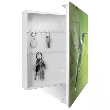 Bringe Ordnung und Eleganz in deinen Eingangsbereich mit dem banjado Schlüsselkasten Motiv Motiv Kolibri. Die moderne Schlüsselbox kombiniert funktionales Design mit hochwertiger Verarbeitung und wird so zu einem echten Hingucker in Flur, Büro oder Ferienwohnung. ✅ Stilvolle Schlüsselaufbewahrung mit Glasfront im Motiv Motiv Kolibri Der Design-Schlüsselkasten Motiv Motiv Kolibri bietet Platz für bis zu 50 Schlüssel, die auf 5 stabilen Reihen mit je 10 Haken übersichtlich verstaut werden. Mit seinen kompakten Maßen von 30 x 30 x 5 cm passt die Schlüsselbox perfekt auch in kleinere Räume. Der weiß lackierte Stahlkorpus mit rechts angeschlagenem Türscharnier harmoniert mit der Glasfront und fügt sich nahtlos in jedes Wohnambiente ein. Ob als Schlüsselorganizer für Zuhause oder als praktische Lösung für Büros, Praxen und Gewerbe, der banjado Schlüsselkasten sorgt für Ordnung und Übersicht. Dank der magnetischen, mit Kreidestiften beschreibbaren Glasfront kannst du Notizen anheften oder Termine direkt auf der Oberfläche festhalten. Die Schlüsselbox Motiv Motiv Kolibri zur Wandmontage wird inklusive Befestigungsmaterial geliefert und ist schnell angebracht. So hast du deine Schlüssel jederzeit griffbereit und zugleich stilvoll verstaut. Mit diesem banjado Schlüsselkasten Motiv Motiv Kolibri kombinierst du praktische Aufbewahrung mit stilvollem Wohndesign. Ob privat oder geschäftlich, die Schlüsselbox sorgt für mehr Ordnung, Übersicht und ein wohnliches Ambiente.Vorteile im Überblick